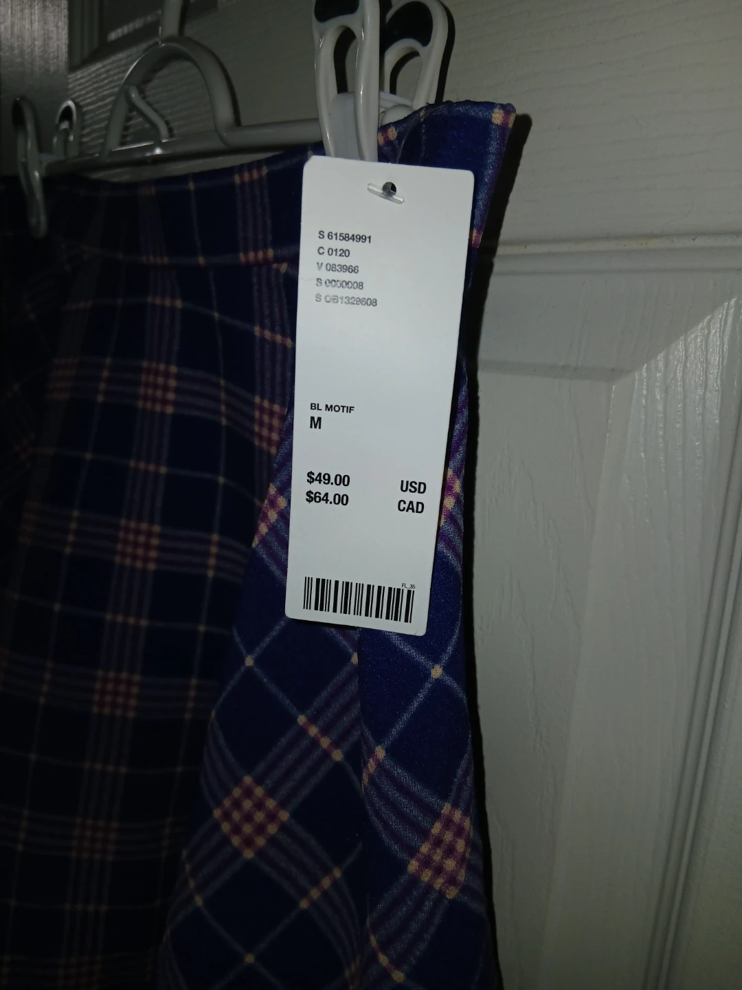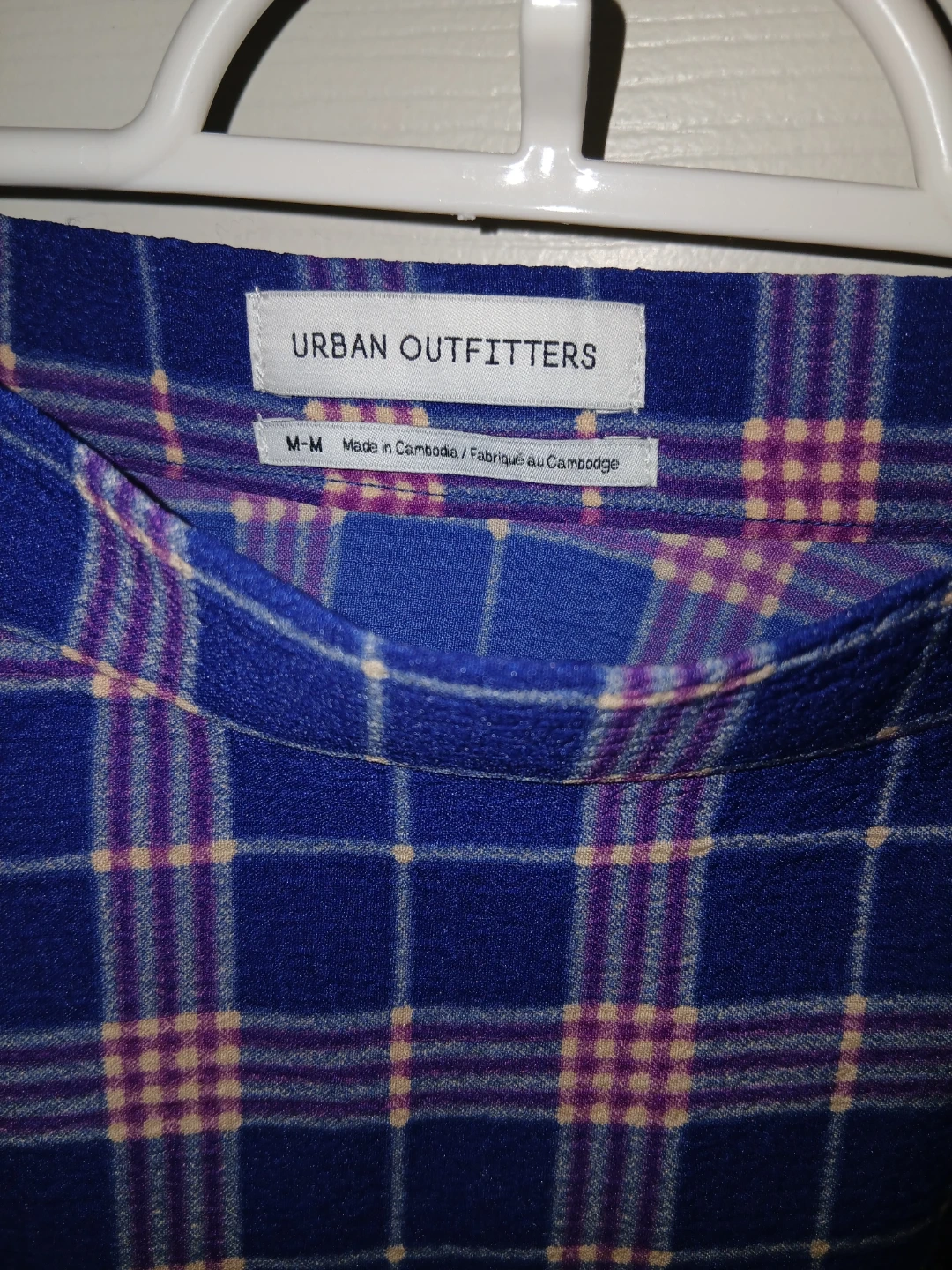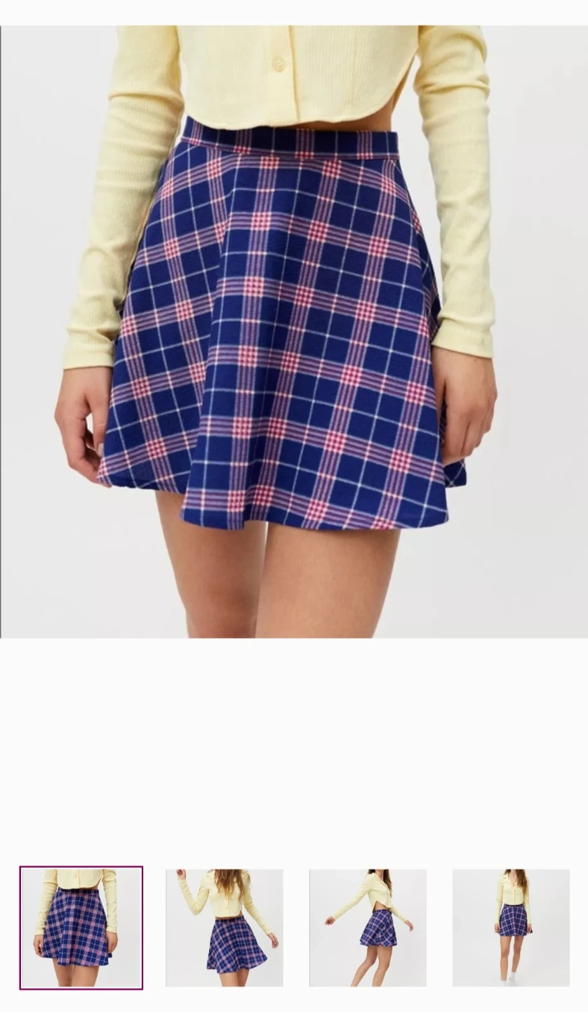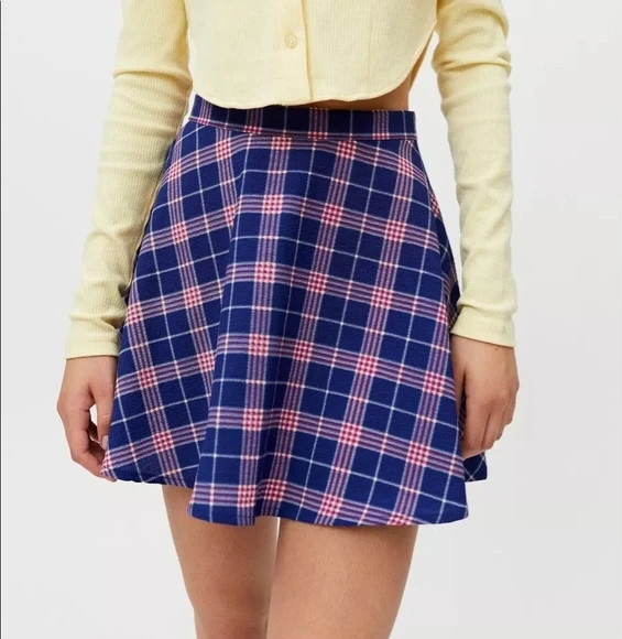 This is a blue plaid skater skirt from Urban Outfitters, in size medium. The fabric feels soft and it has a nice flowy silhouette. Great for pairing with sweaters or blouses!