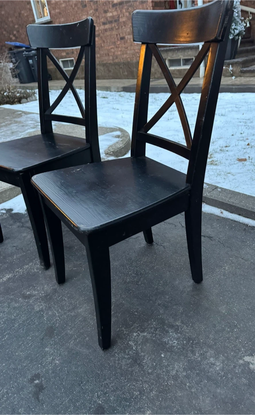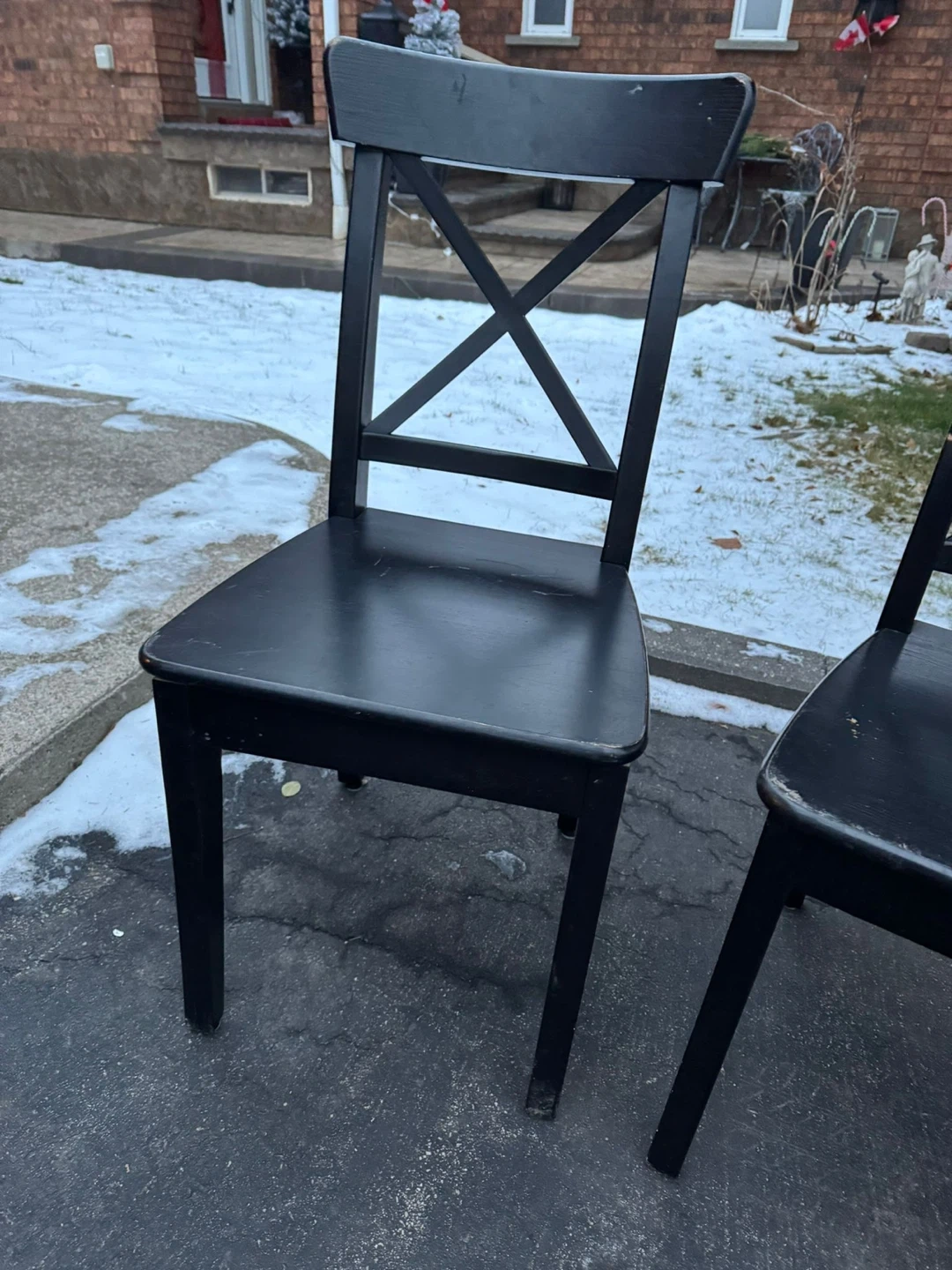 Selling a set of two black dining chairs with a cross back design. They're in good condition and would look great in any dining room or kitchen!