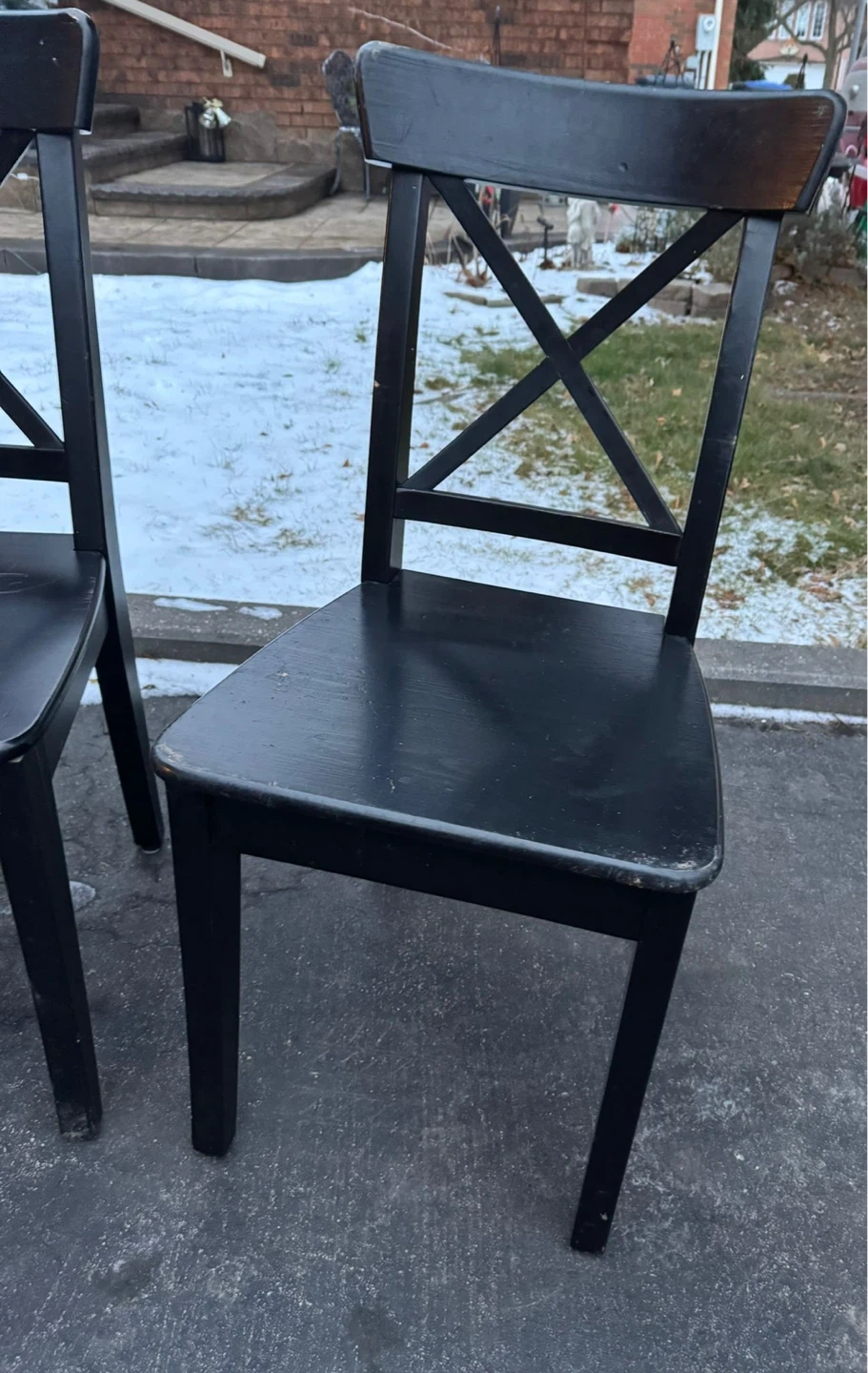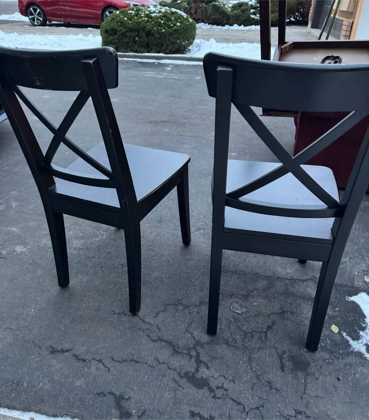 Selling a set of two black dining chairs with a cross back design. They're in good condition and would look great in any dining room or kitchen!