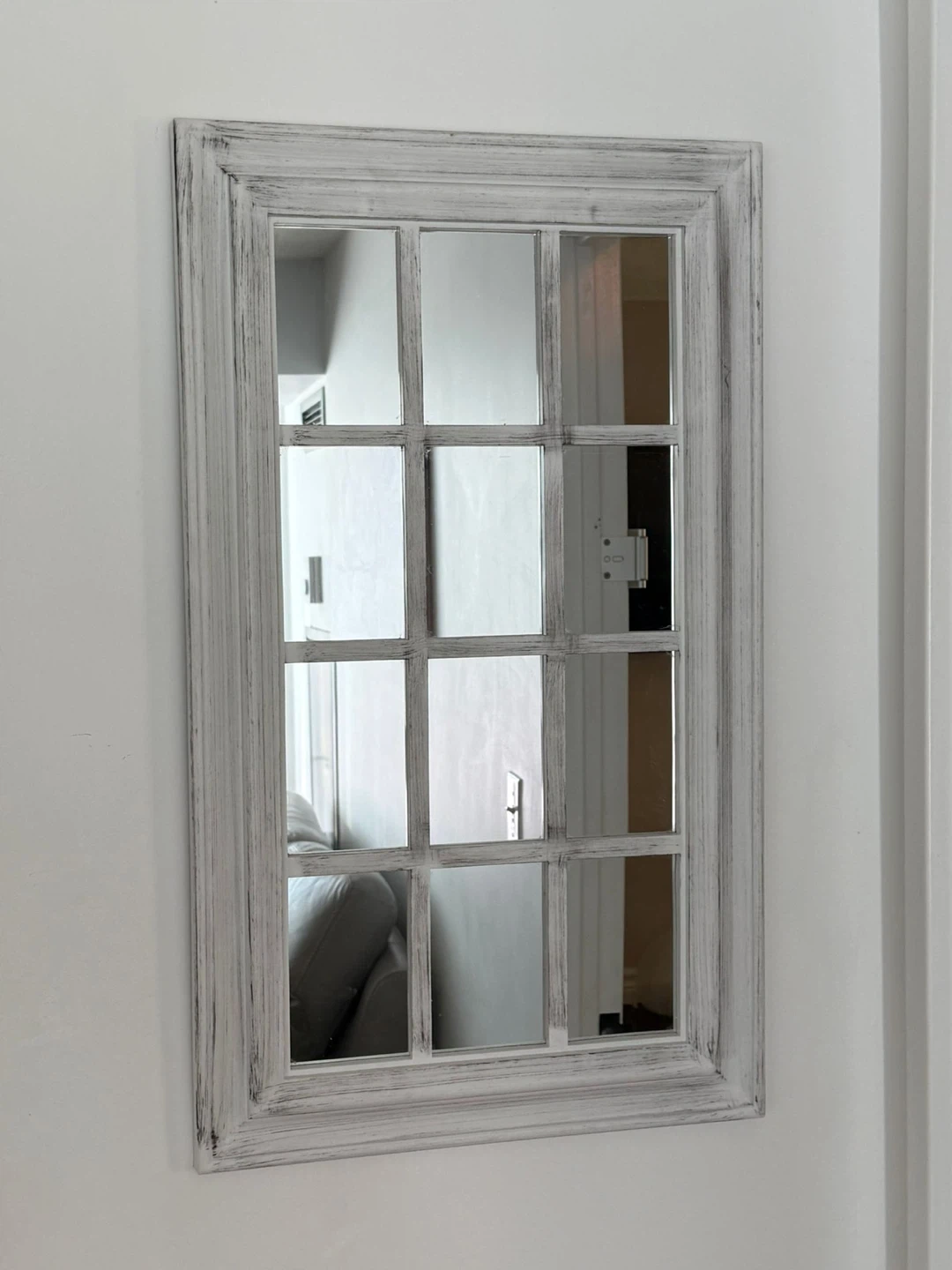 Here's a lovely window pane mirror with a whitewashed frame! It's perfect for adding a touch of rustic charm to any room. The mirror is in great condition and ready to brighten up your space
