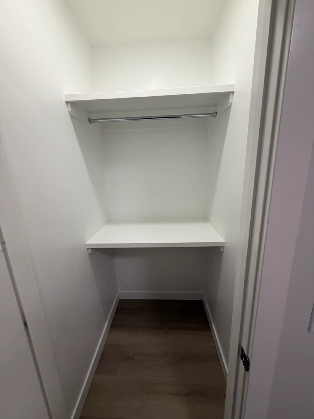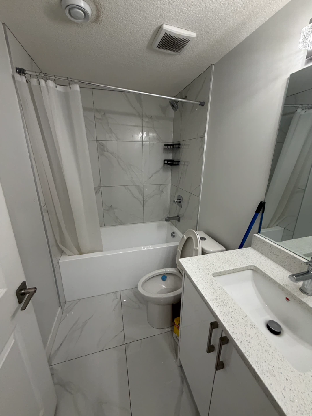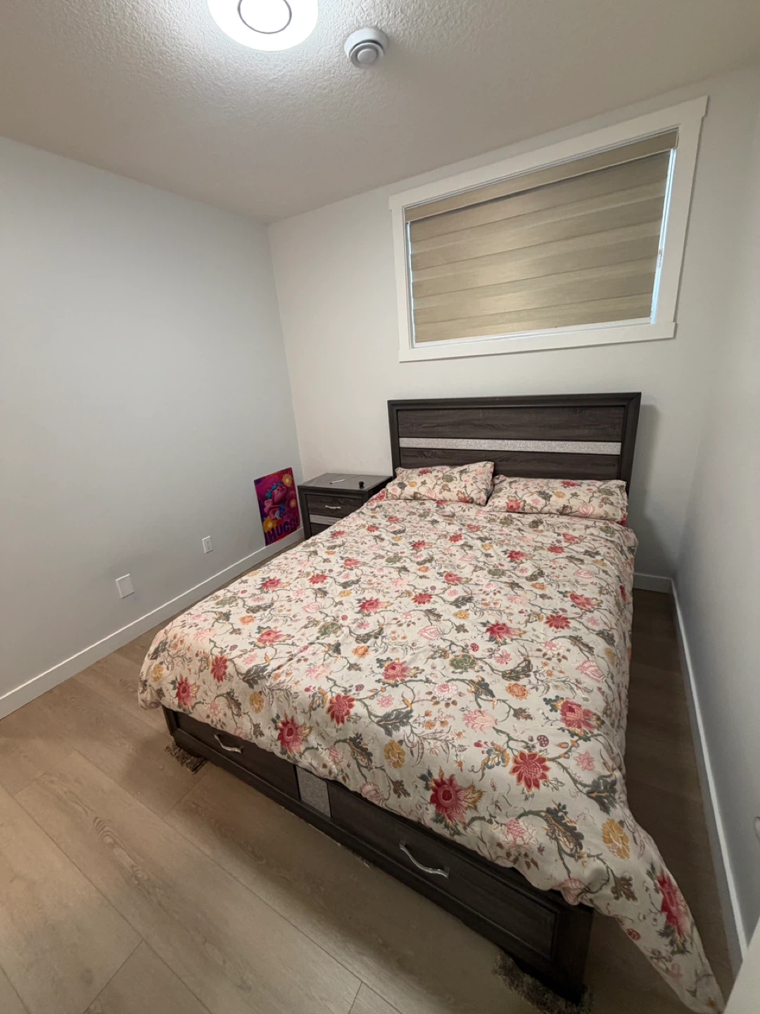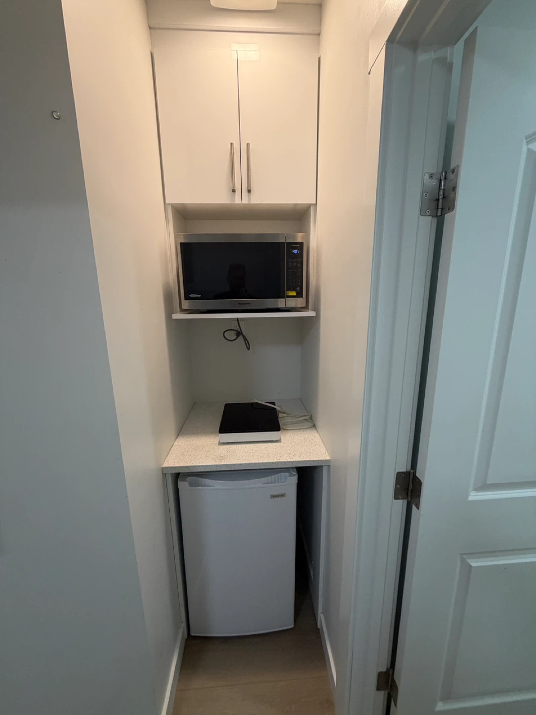This listing includes a queen-sized bed with a floral comforter and matching pillows, a dark wood nightstand with two drawers, a compact microwave, and a mini fridge. It also includes a full bathroom with a tub, shower, toilet, and vanity. The bedroom has a spacious closet with shelving and a hanging rod.