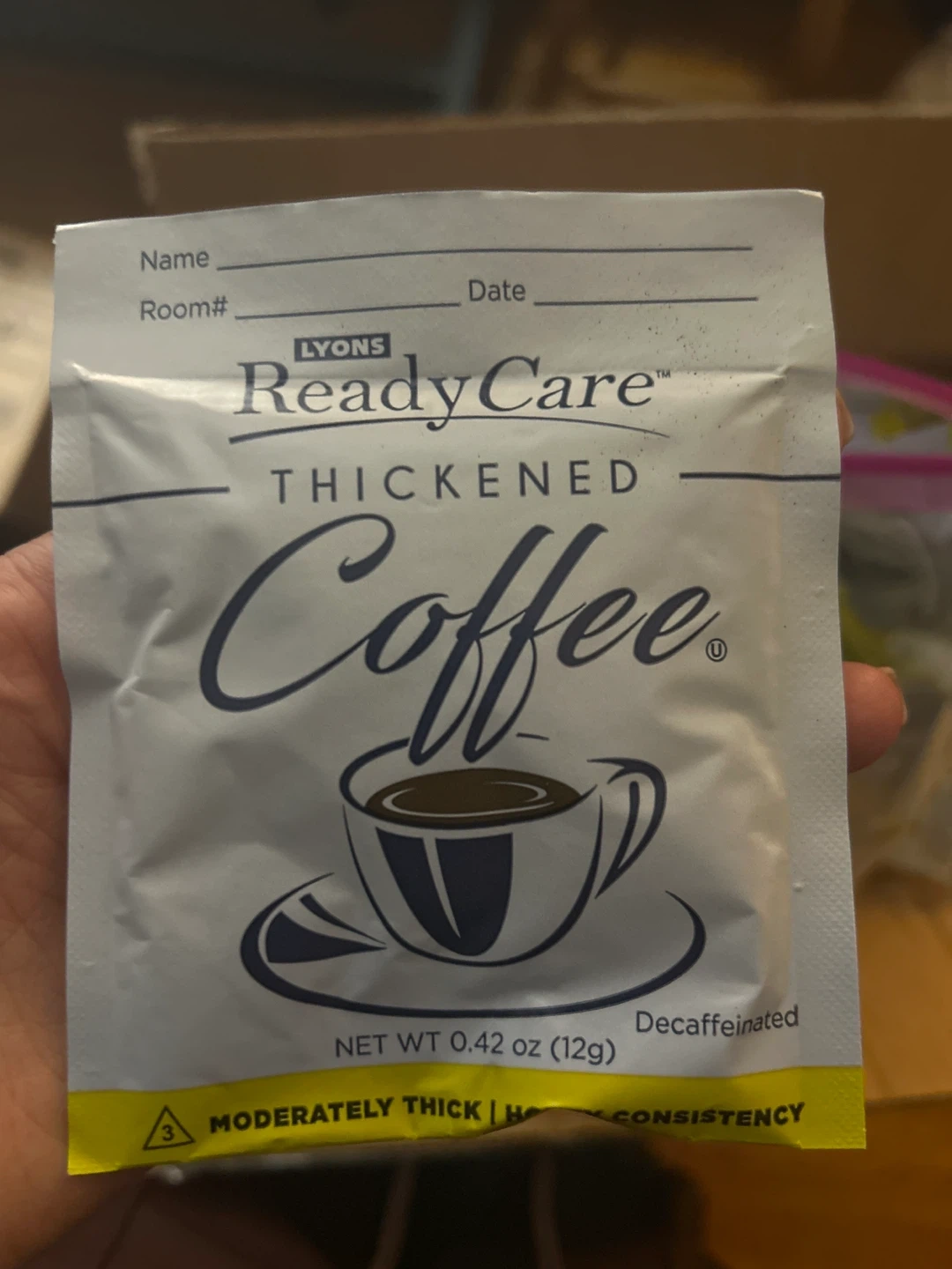 Selling a Lyons ReadyCare Thickened Decaffeinated Coffee packet. It's a single-serve packet with a net weight of 0.42 oz (12g). The coffee is moderately thick in consistency. 41 individual packets available