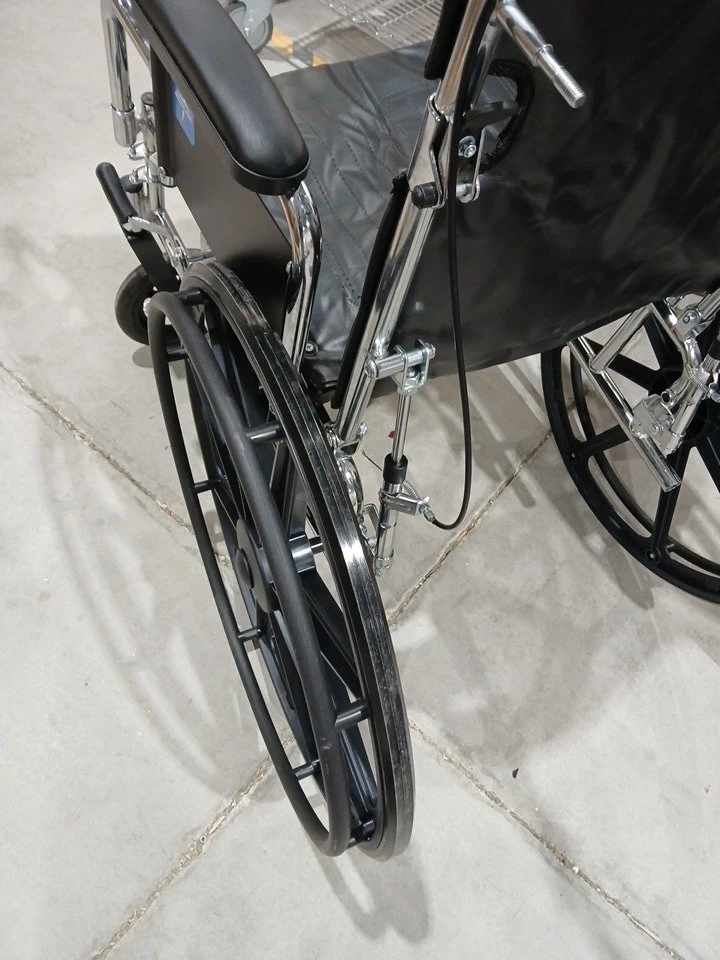 This is a new Medline Excel reclining wheelchair, designed for comfort and support with a weight capacity of 350lbs. πͺβΏ It features a 22-inch full back with a 10-inch removable headrest, allowing for infinite reclining positions from 90 to 140 degrees, adjustable with quick-adjust handles. πποΈ The carbon steel frame is coated with chip-resistant chrome plating, ensuring durability. π‘οΈπ It also features anti-tippers. π«π€Έ