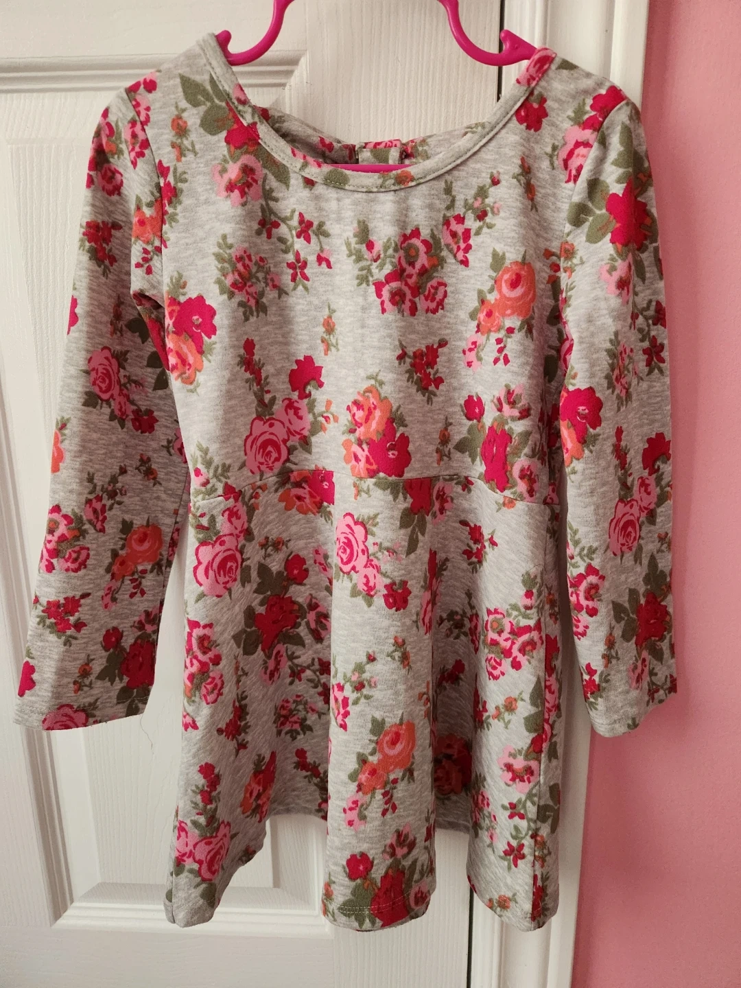 This girls' long-sleeve dress features a lovely all-over floral print on a grey background. It's a comfortable, casual option for everyday wear.