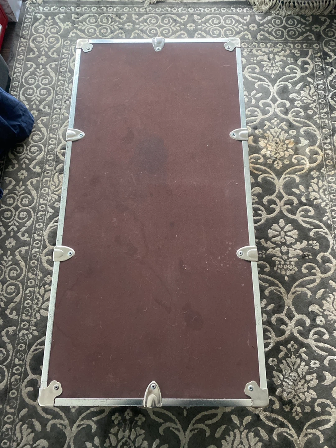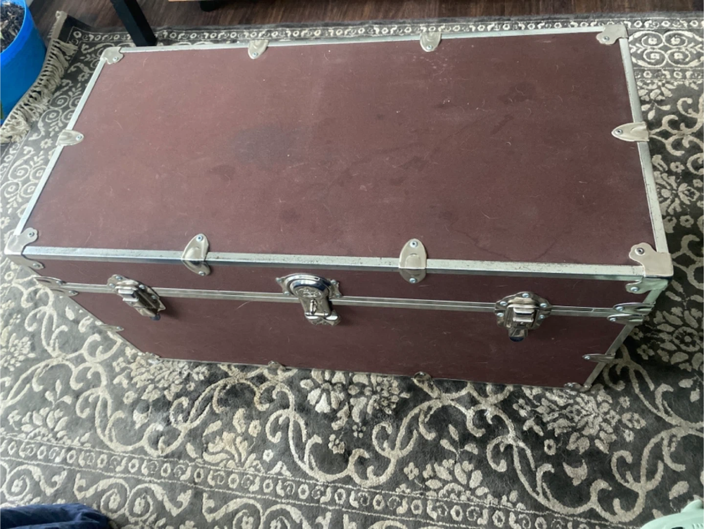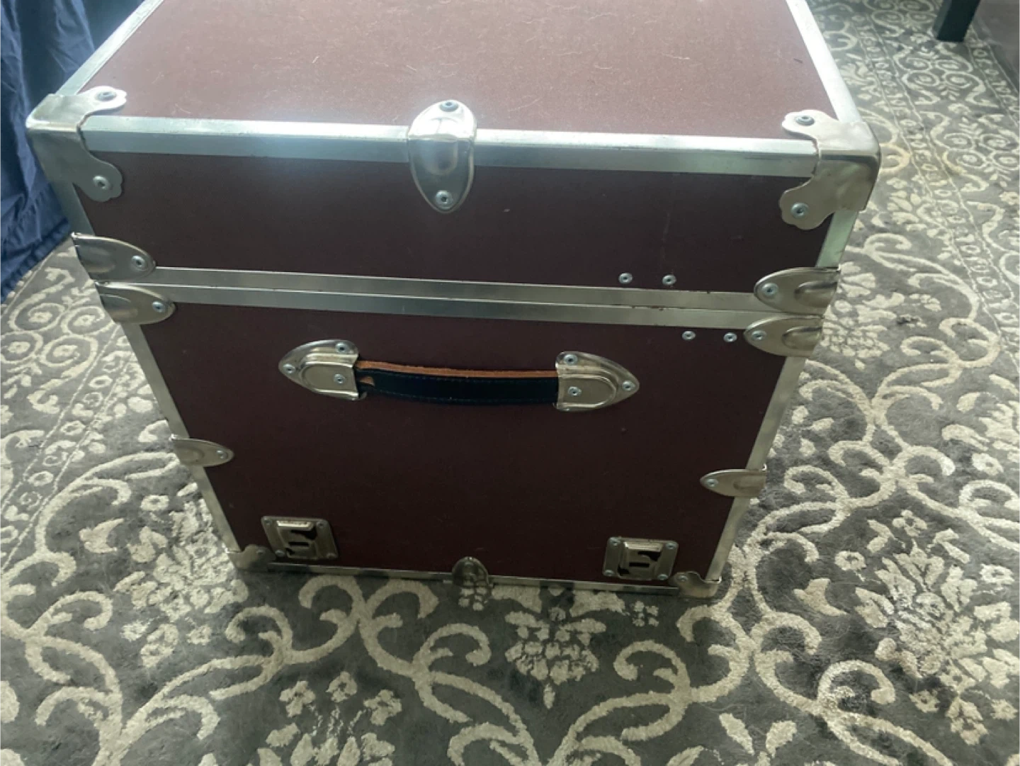 This is a classic steamer trunk. It's a deep brown colour with metal accents and latches. It has a leather handle for carrying. It's great for storage or as a decorative piece!
