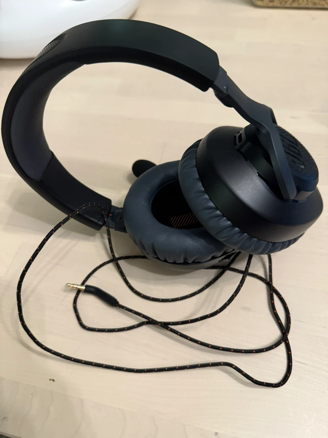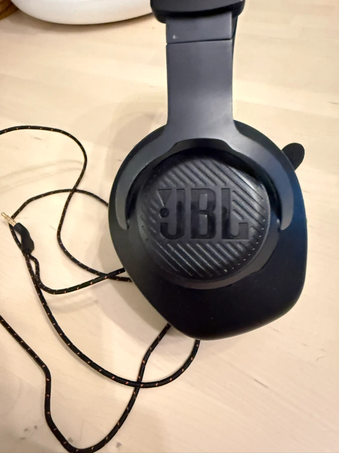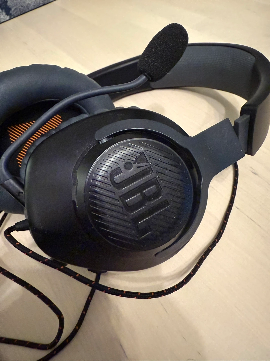 This is a JBL gaming headset. It features a flexible microphone and comfortable earcups with L and R indicators.