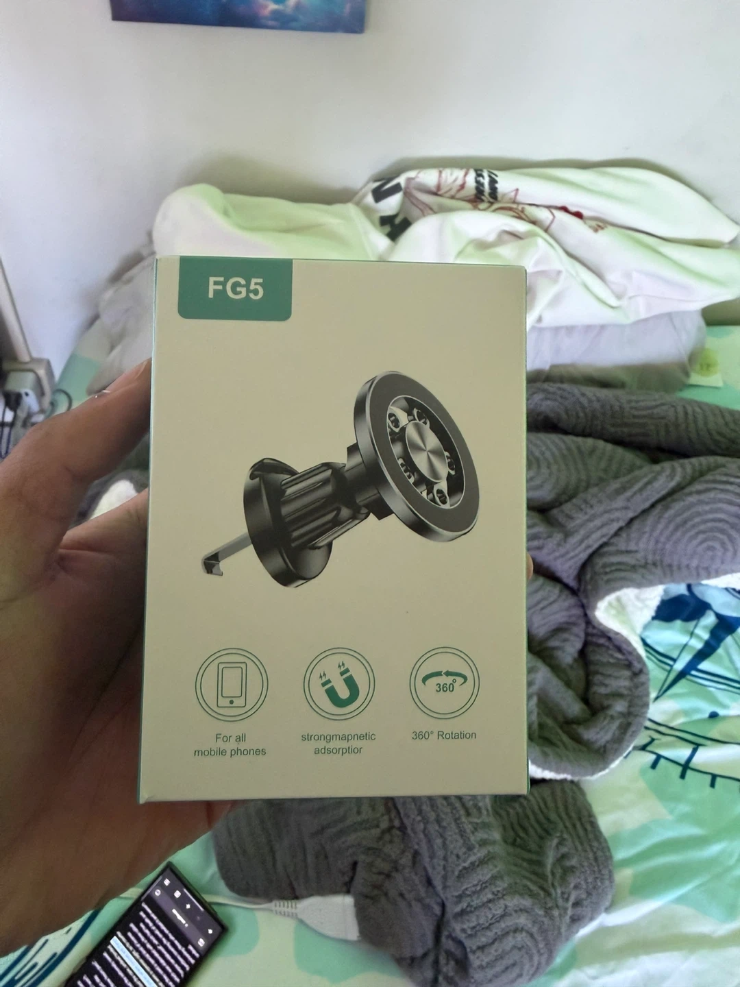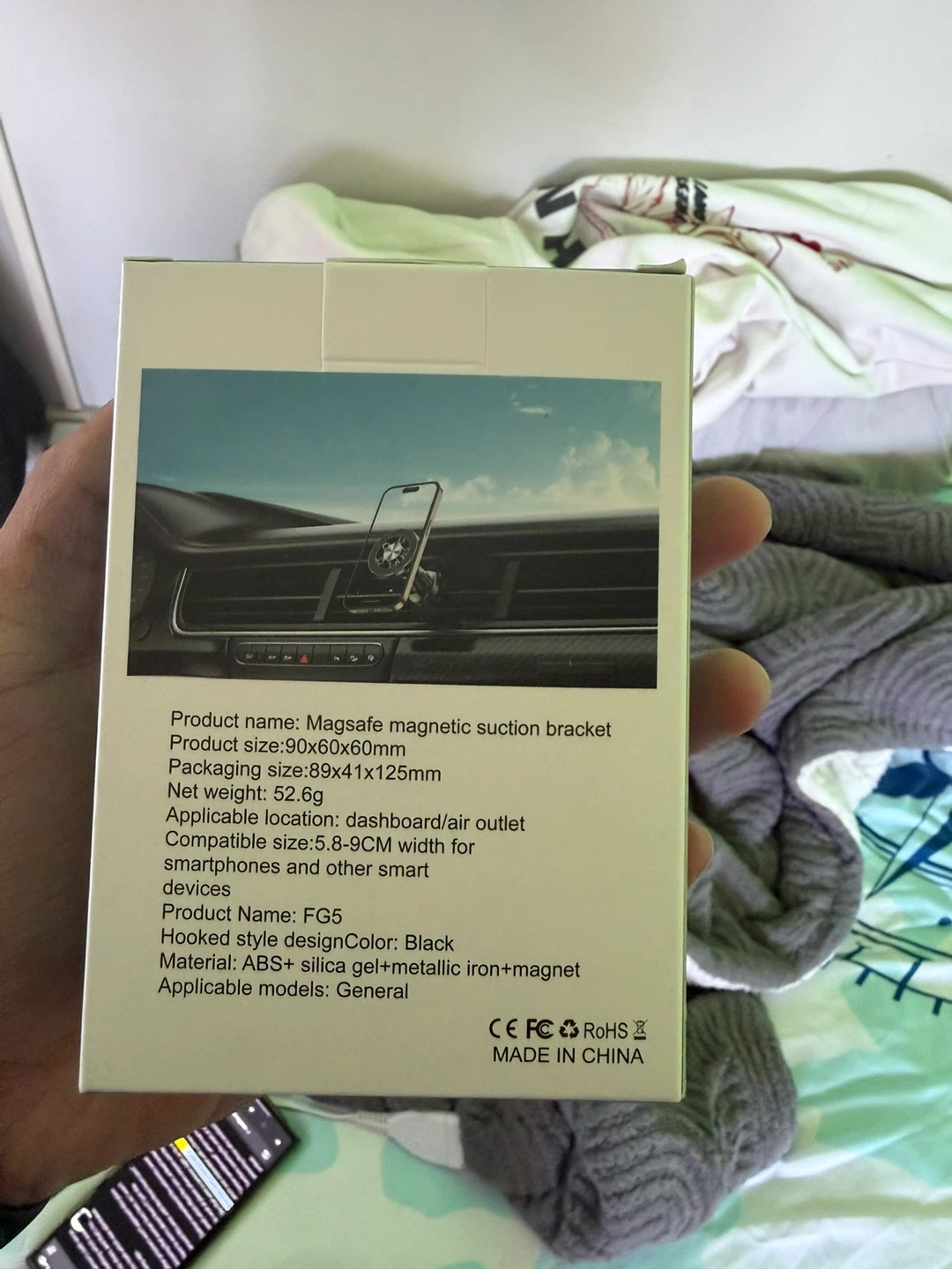 This is a MagSafe magnetic suction bracket for smartphones. It's a black, hooked style design made from ABS, silica gel, and magnetic iron. The bracket's packaging size is 89x41x125mm and it weighs 52.6g. It's applicable for general use on dashboards or air outlets and fits smartphones between 6-9cm wide.