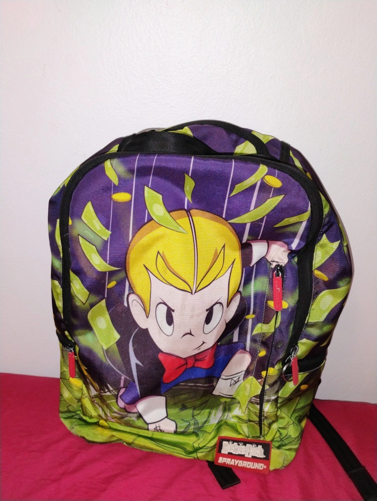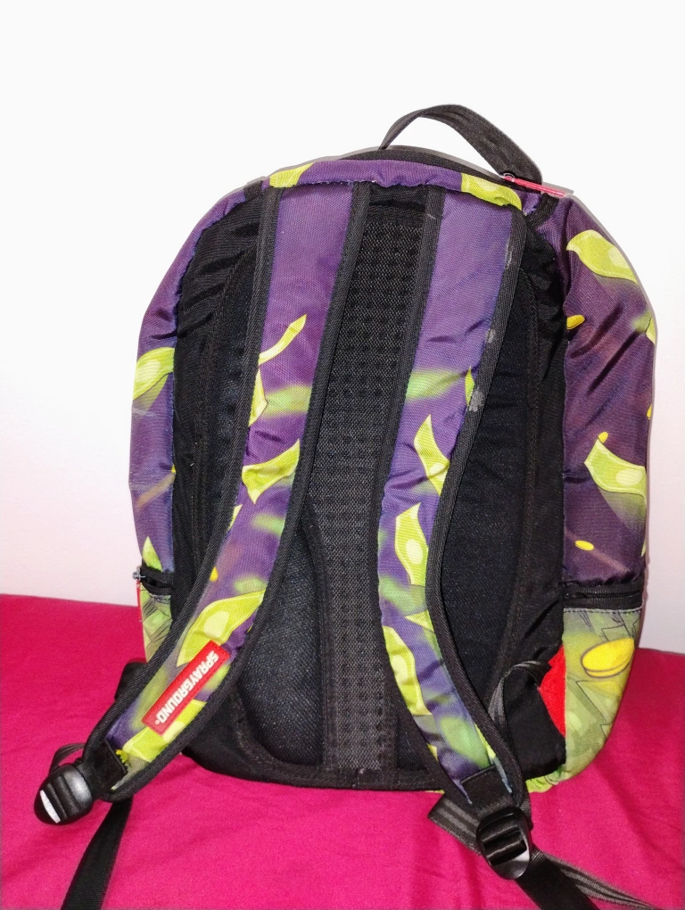 Sprayground backpack with a unique design. It features a colorful graphic on the front and adjustable straps for comfortable wear. The backpack has multiple compartments, including a zippered main compartment and smaller pockets for organization. ready for a new owner!