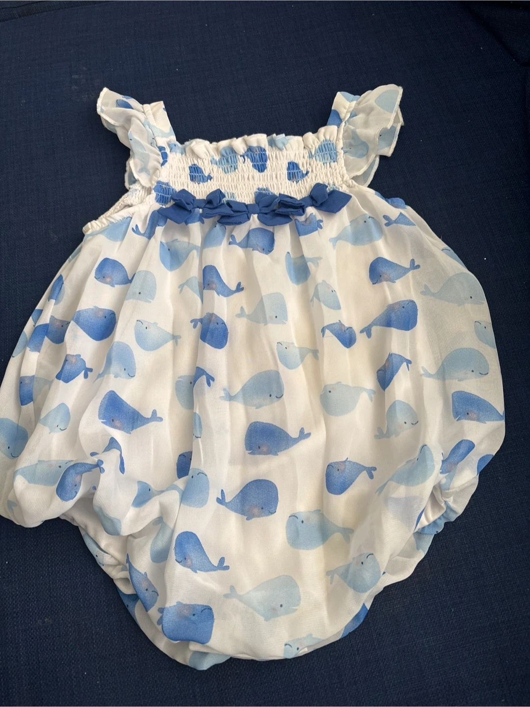 Adorable white romper with a blue whale print. Features smocking detail at the chest with little blue bows. Perfect for warm weather days!only worn once.