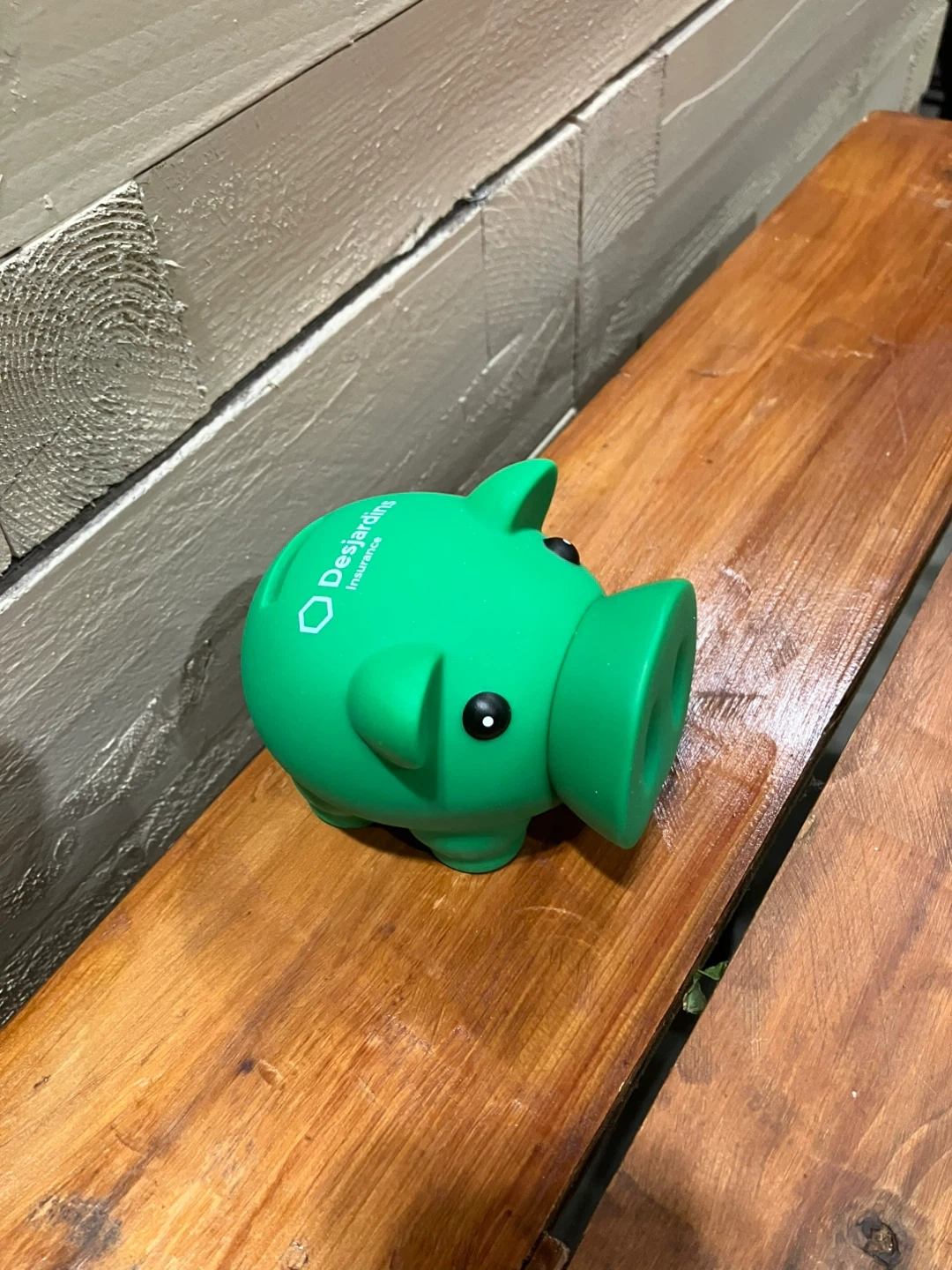 Cute green piggy bank from Desjardins Insurance! It's in great shape and ready for a new home to collect some savings