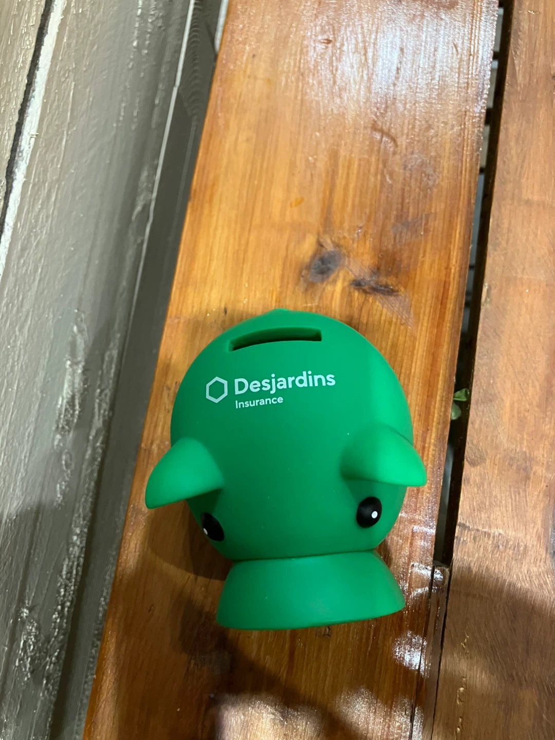 Cute green piggy bank from Desjardins Insurance! It's in great shape and ready for a new home to collect some savings