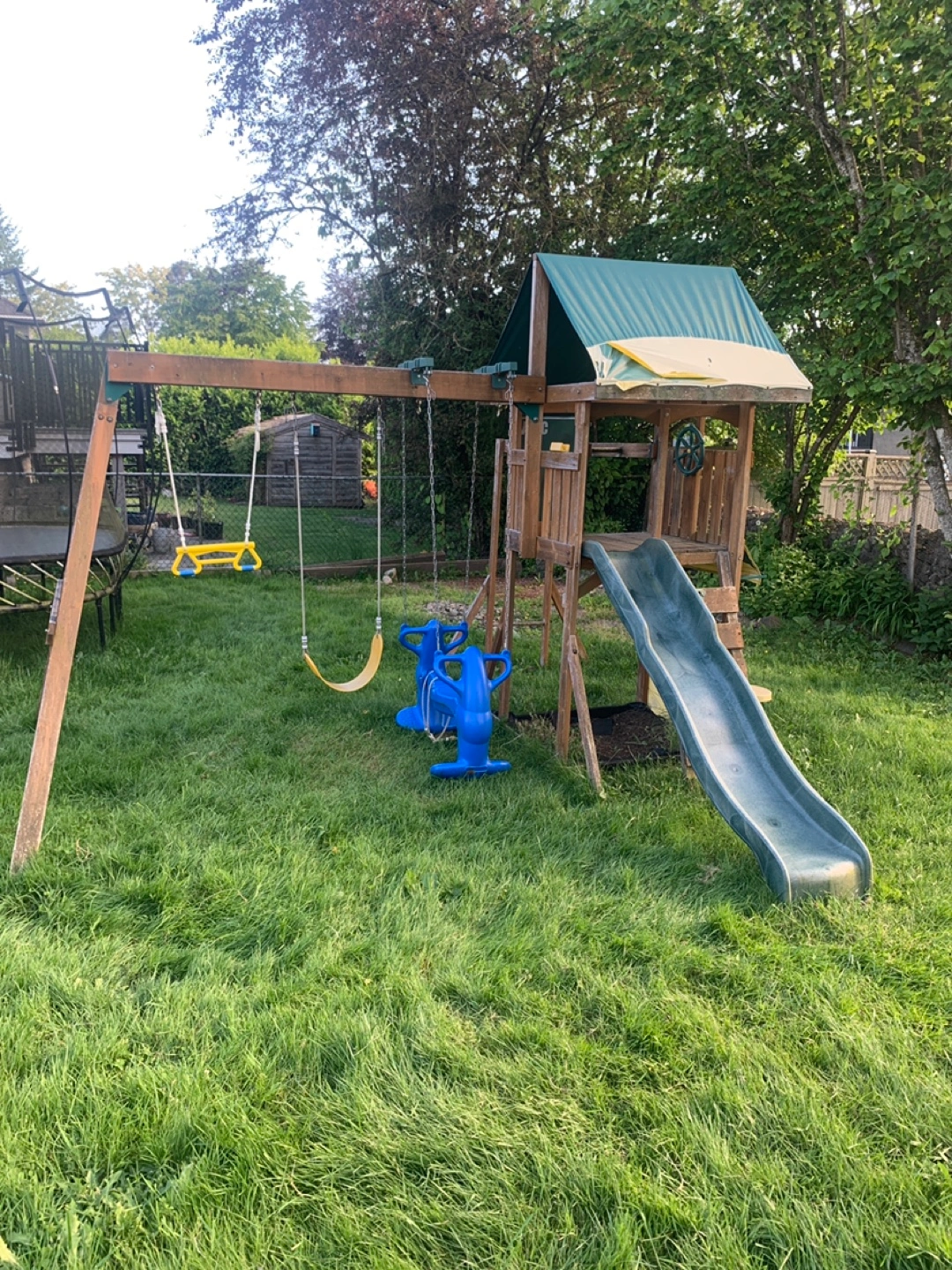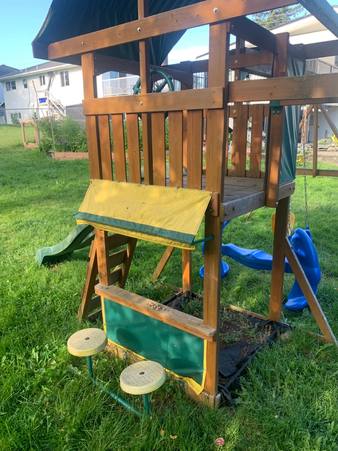 Kids' wooden playset. Features a climbing ladder, double rider swing ,slide, swings, pull up bar , monkey bars and a small sandbox. some wear from outdoor use. Great for backyard fun!