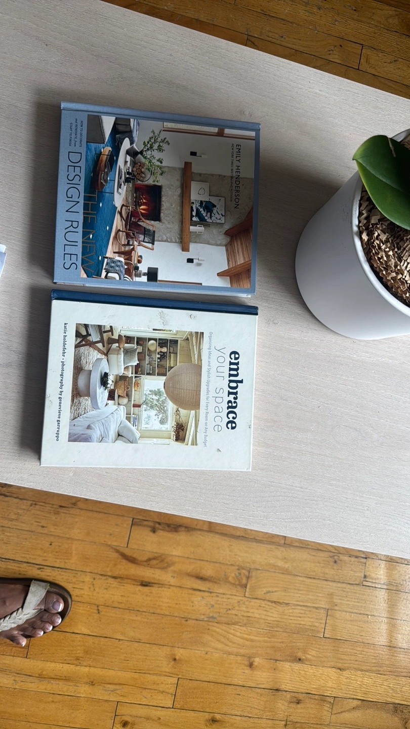 Selling two books: "Design Rules" by Emily Henderson and "Embrace Your Space" by Katie Holdefehr. Both offer great ideas for home decor and organization