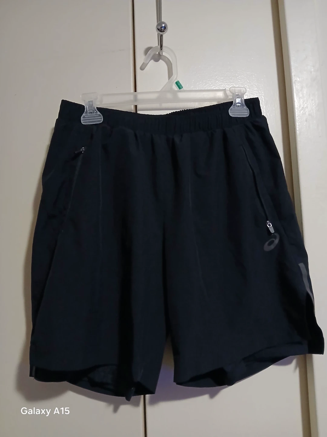 Black Asics running shorts with zippered pockets and reflective accents. These shorts are designed for athletic performance. They're lightweight and breathable for comfortable wear during workouts.