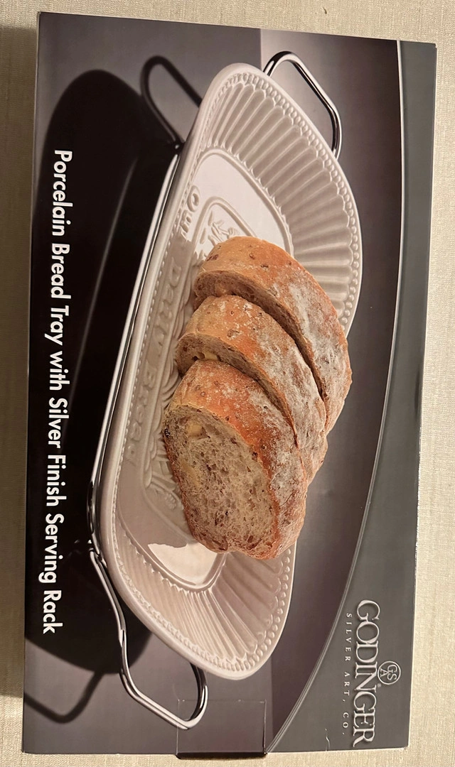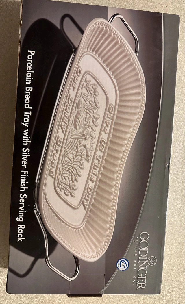 Porcelain bread tray with Give us this day our daily bread imprint. Brand new on box. Evening or weekend pickup only. Closest major intersection is Hurontario Street and Central Parkway in Mississauga.