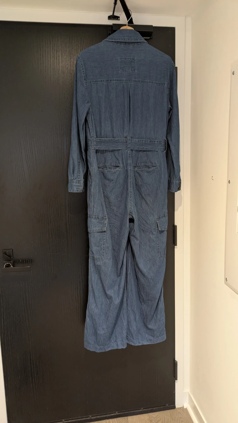 Selling a Banana Republic denim jumpsuit in size medium, fits 8. It's in great condition and ready for a new home. The denim is a nice, classic wash, and it features a belted waist and cargo pockets for a stylish and practical look