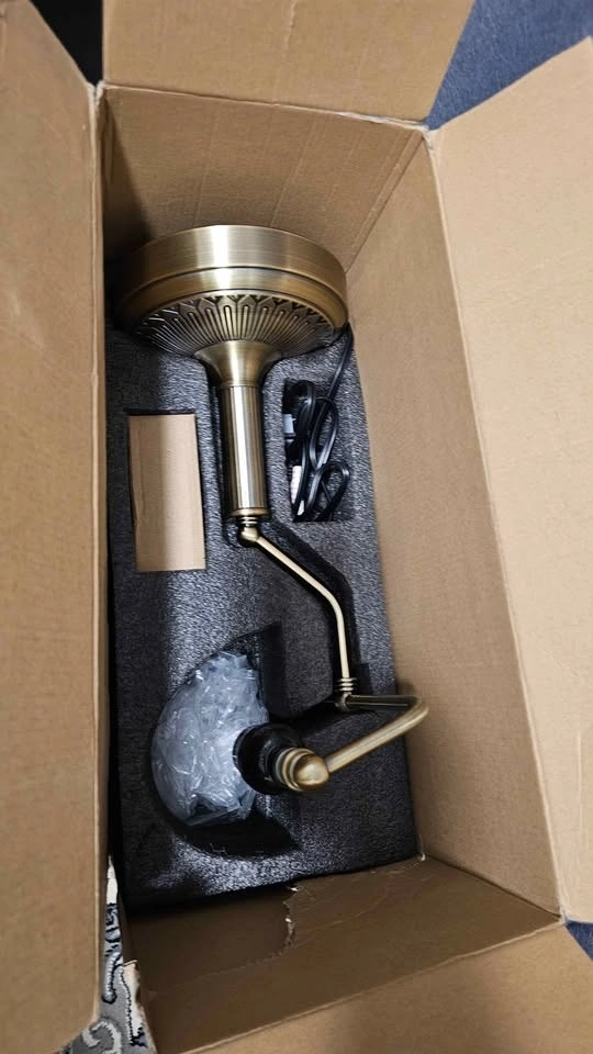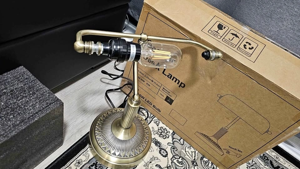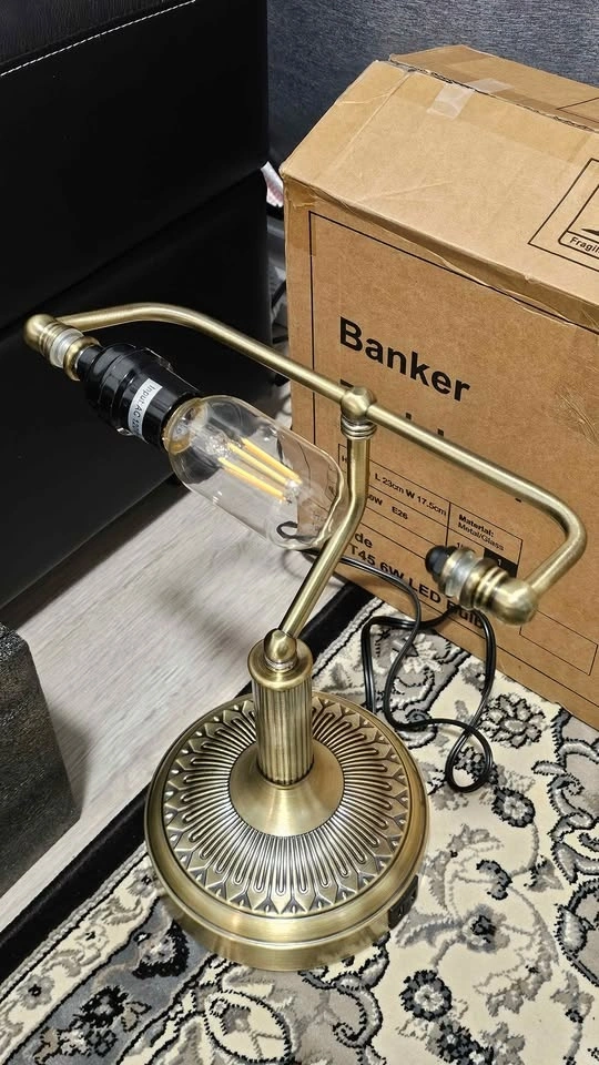 New brass banker lamp with a cool vintage style and modern USB-A and USB-C charging ports on the base (5V 2.1A). Includes a T45 6W LED bulb. Made of metal and glass. Measures approximately 38cm H x 23cm L x 17.5cm W. Please note the glass shade is missing.
