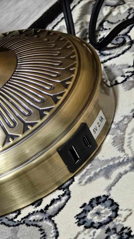 New brass banker lamp with a cool vintage style and modern USB-A and USB-C charging ports on the base (5V 2.1A). Includes a T45 6W LED bulb. Made of metal and glass. Measures approximately 38cm H x 23cm L x 17.5cm W. Please note the glass shade is missing.