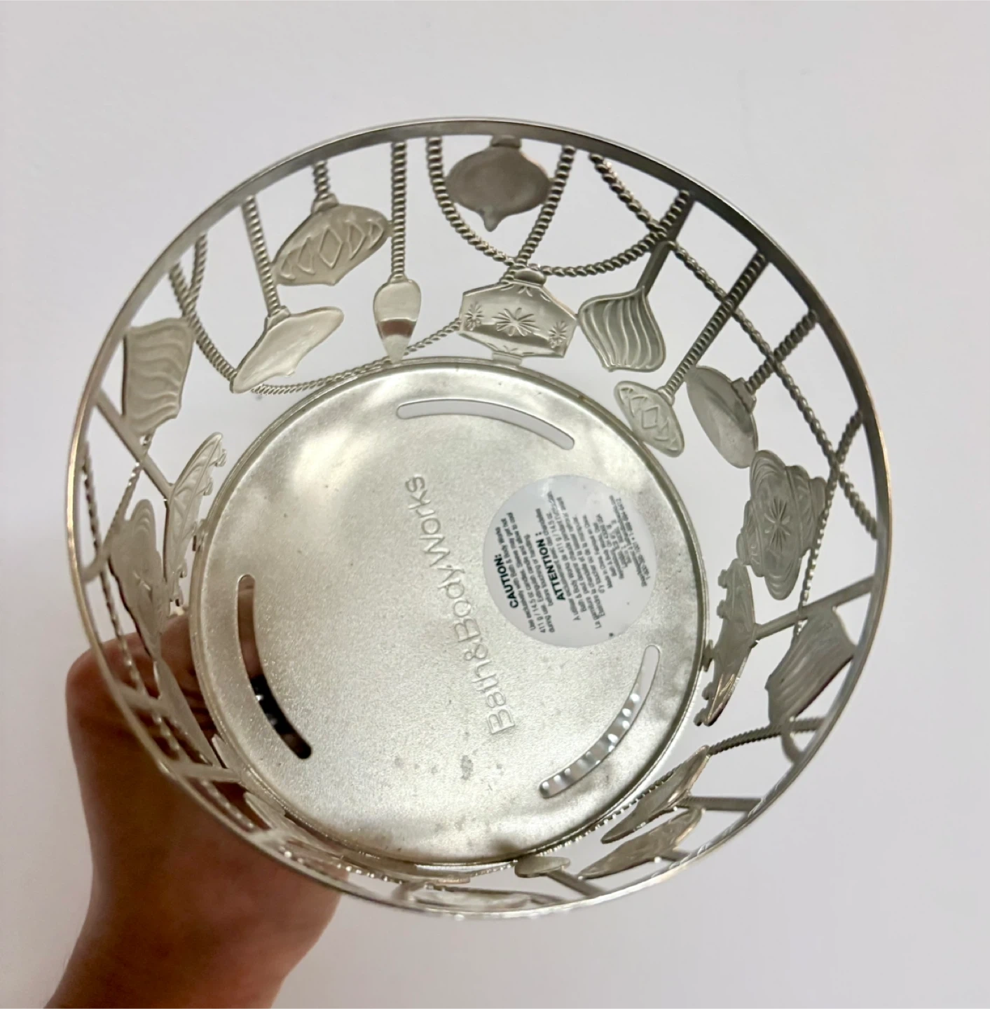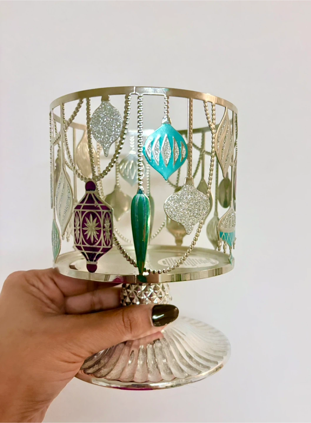 This Bath & Body Works candle holder features a decorative silver-tone metal design with hanging ornaments.