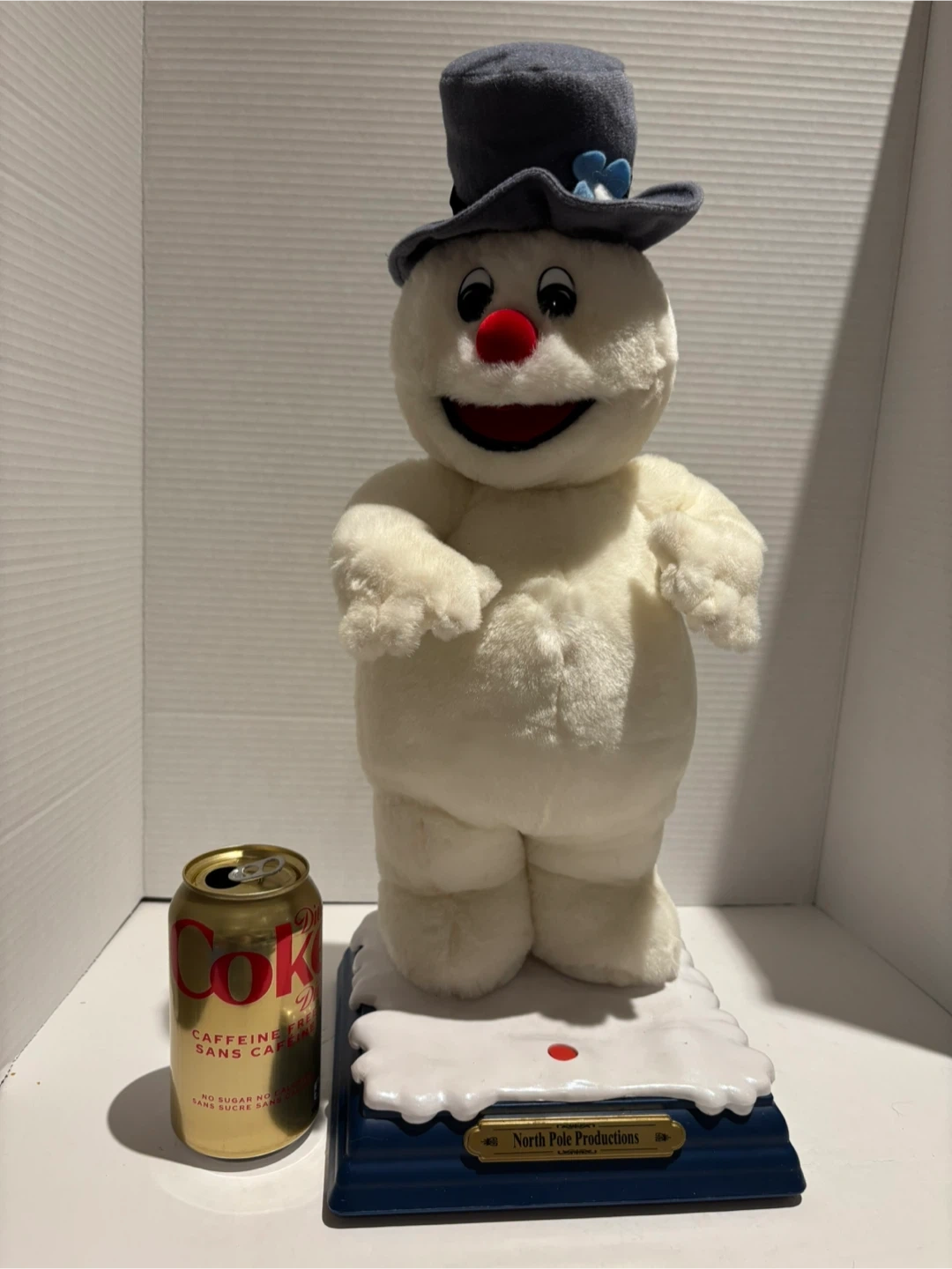 This animated snowman from North Pole Productions is a fun holiday decoration. It's plush and stands on a decorative base. Bring some festive cheer to your home this season!