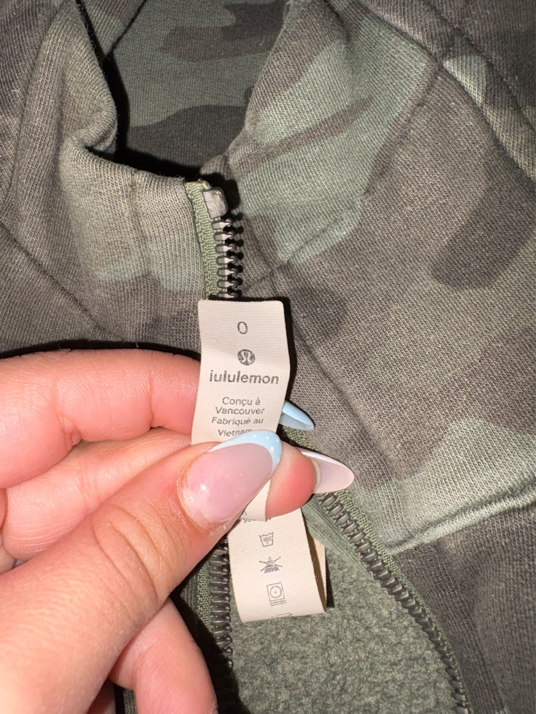 Lululemon zip up in a camouflage pattern. Designed in Vancouver. Made in Vietnam. Full zip closure with pockets.