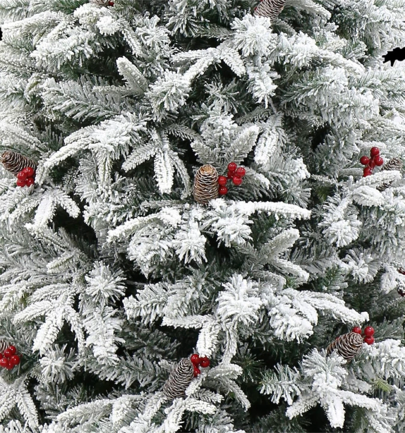 A festive flocked artificial Christmas tree pre-decorated with warm white lights and red berries. It's dusted with a snowy effect and includes pinecones for a rustic winter look. This tree's ready to be the centrepiece of your holiday decor!