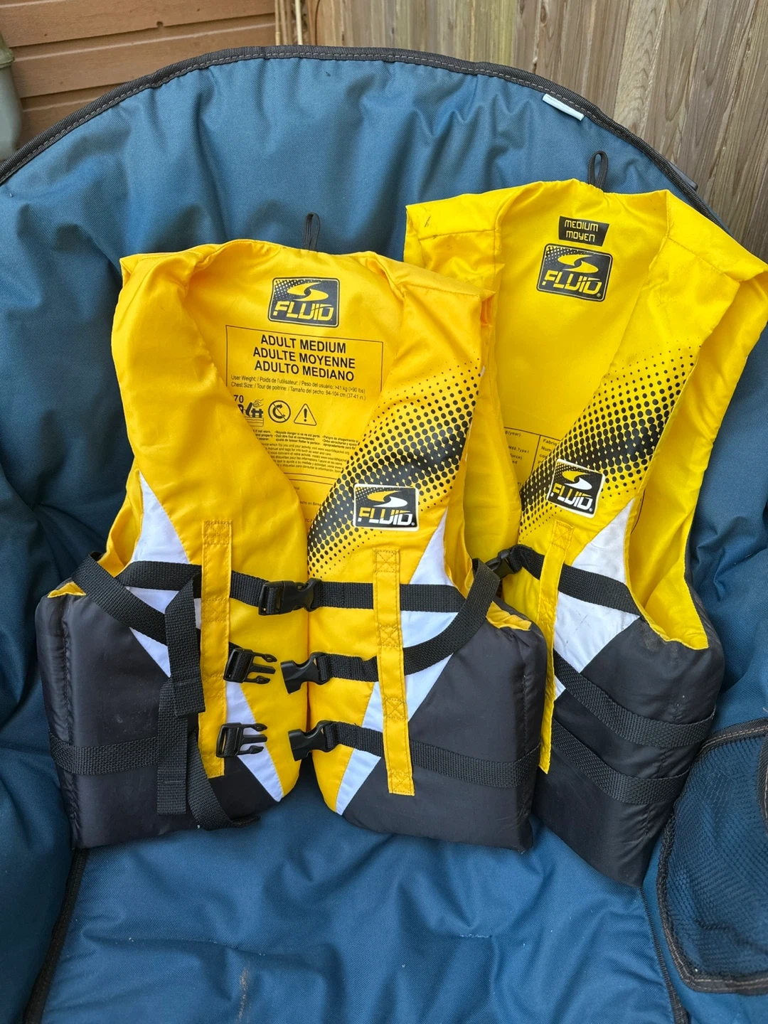 Two yellow Fluid adult medium life vests. Chest size fits 94-104 cm (37-41 in.). These vests are designed for user weights of 41 kg (90 lbs) and up. They're great for water sports and boating activities!