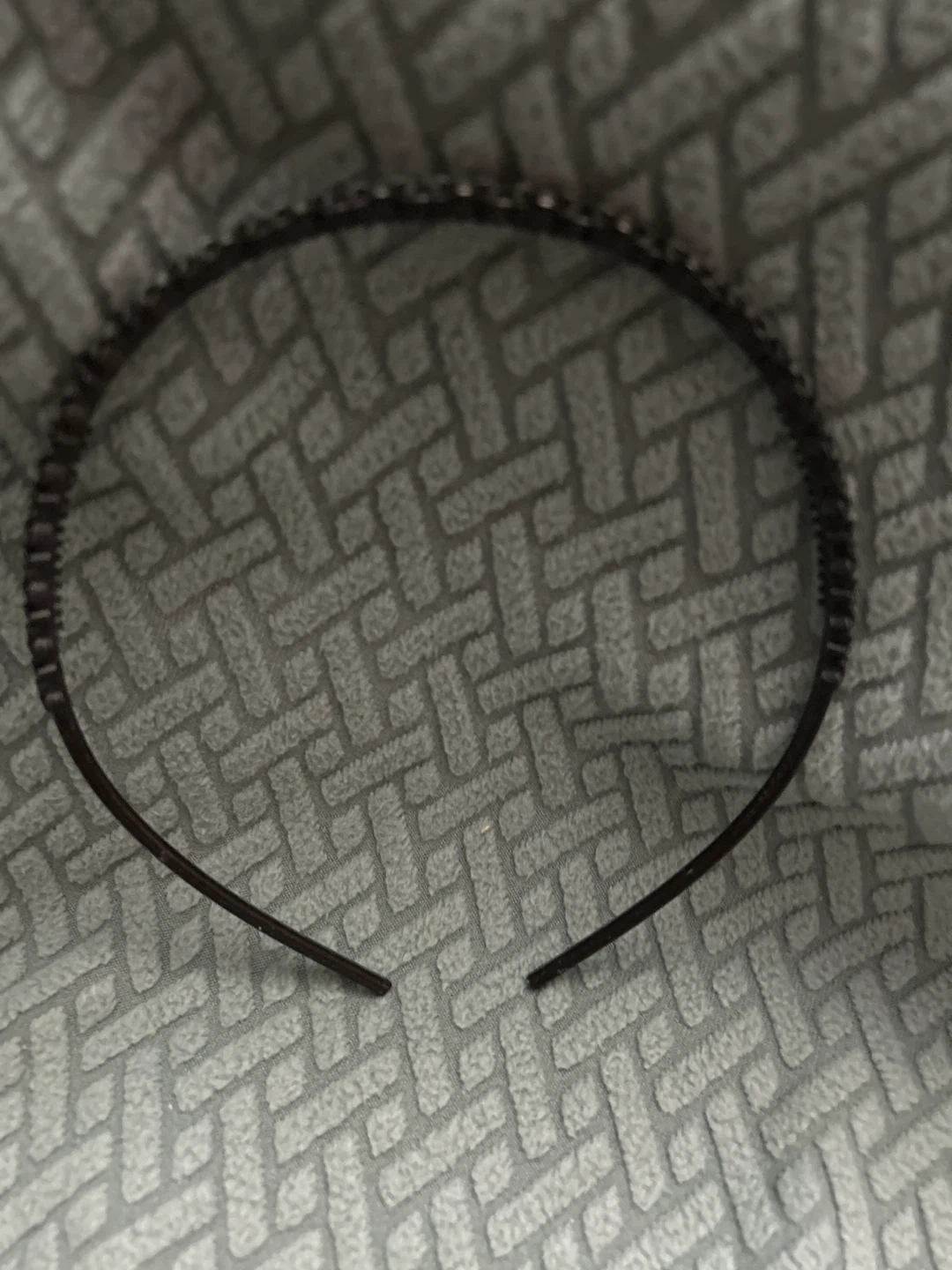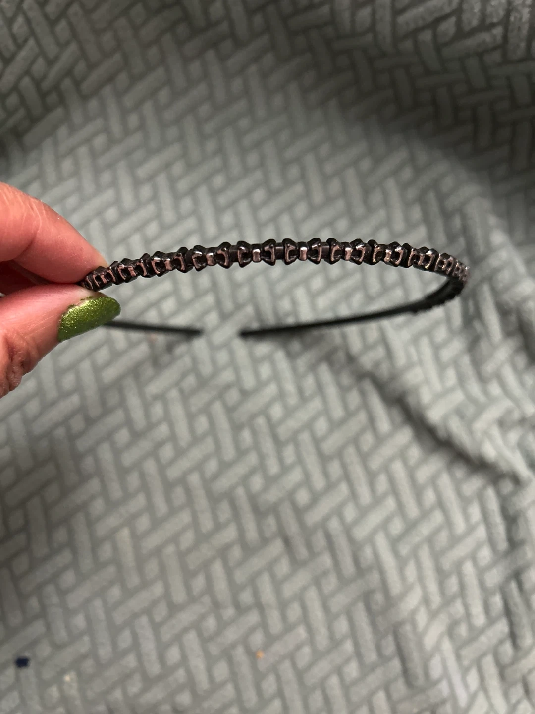 This is a simple, thin metal headband adorned with small, dark beads. It's designed to add a subtle touch of sparkle to your hairstyle. It's a great accessory for keeping hair off your face.