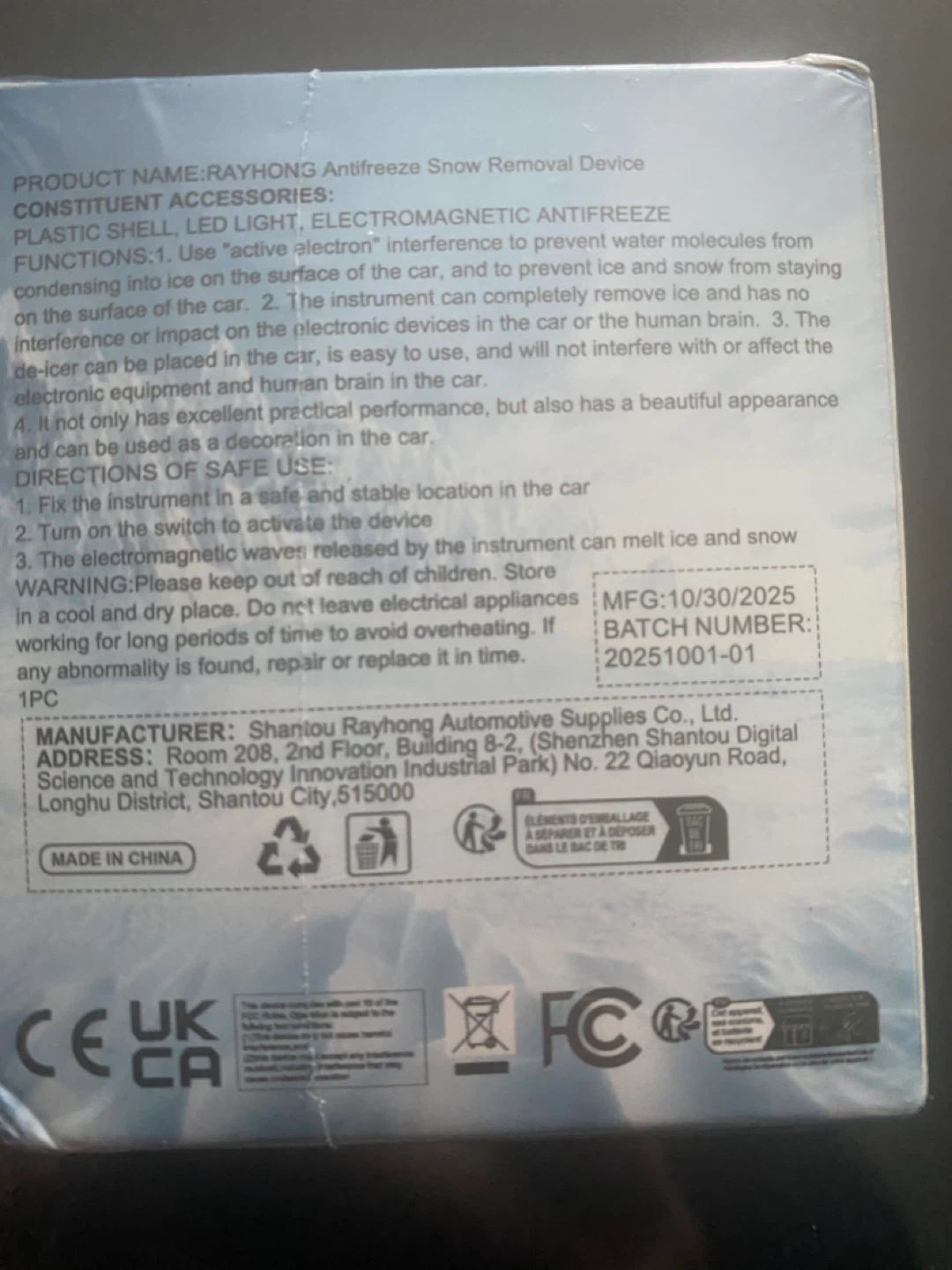This RAYHONG device uses active electrons to prevent water molecules from condensing on the car's surface, melting ice and snow. It's designed to work without interfering with the car's electronic systems. This device is useful during winter weather for maintaining clear visibility.