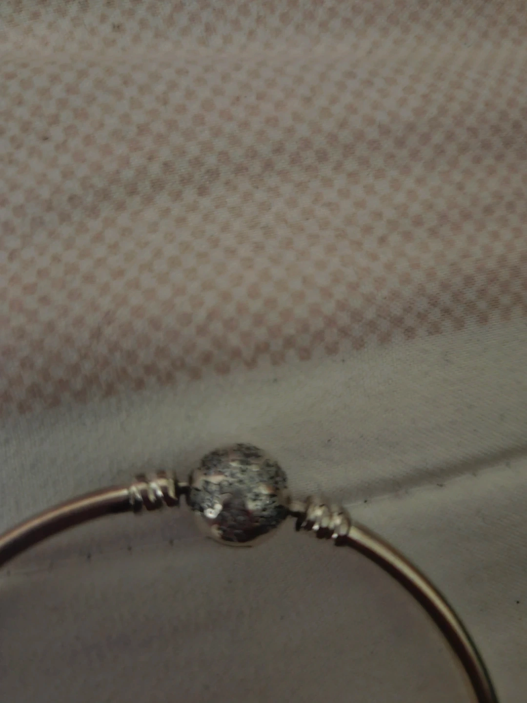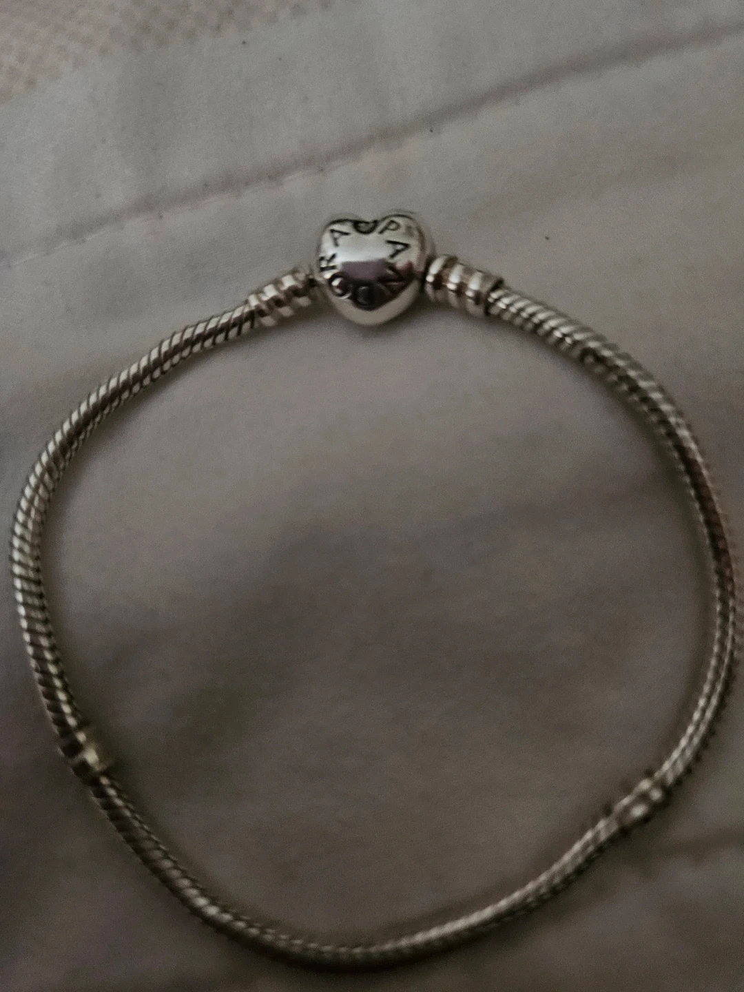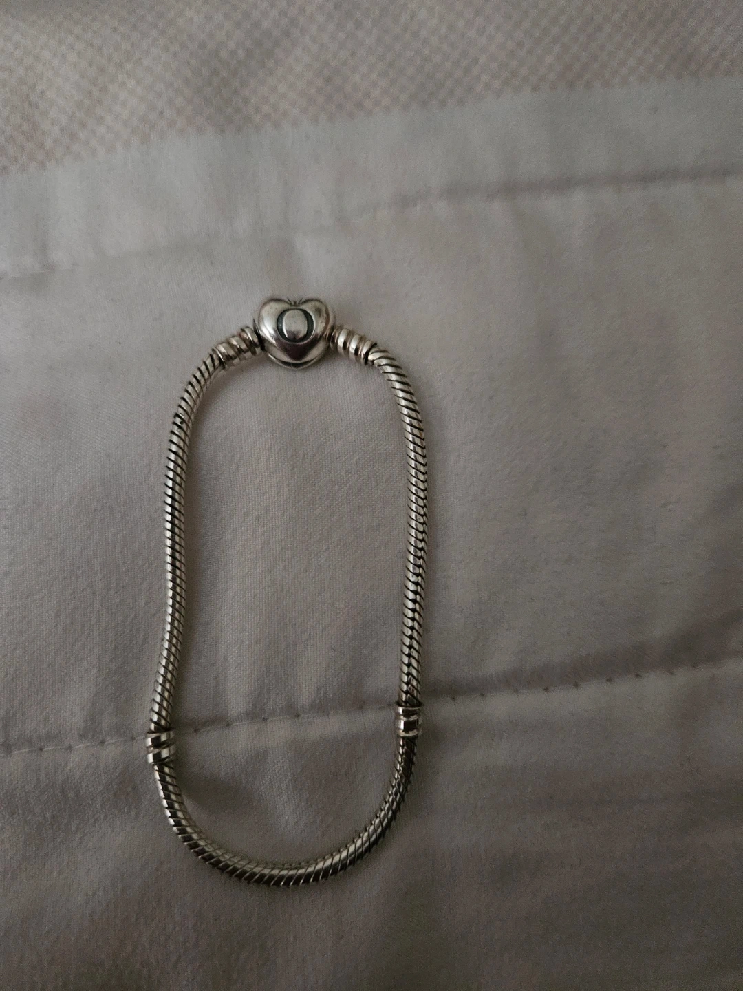 This is a Pandora snake chain bracelet with a heart-shaped clasp. It's made of sterling silver. It's a lovely piece to add charms to! Size 7