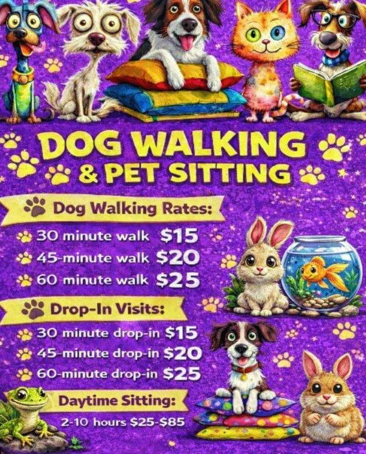Offering dog walking with rates starting at $15 for a 30-minute walk. Drop-in visits are also available for $15 for 30 minutes. Daytime sitting services are provided for 2-10 hours at a rate of $25-$85.