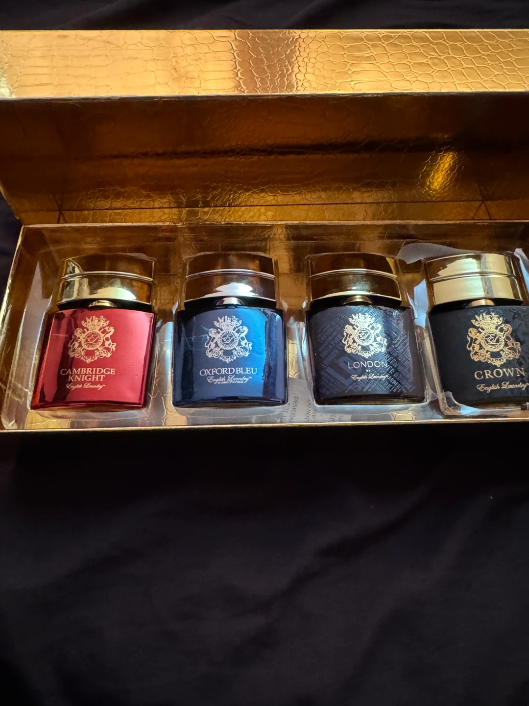 This gift set features four distinct "English Laundry by Christopher Wicks" fragrances. It includes Cambridge, Oxford Bleu, London, and Crown scents. These are travel-sized bottles perfect for sampling different aromas. Brand new only sprayed them once! Message for more details