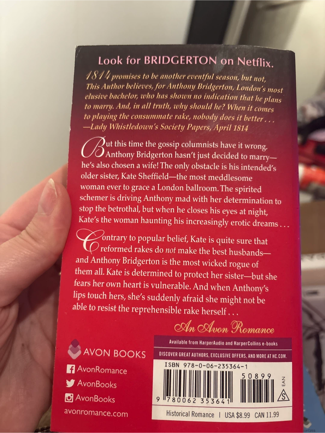 Selling a copy of "The Viscount Who Loved Me" by Julia Quinn, part of the Bridgerton series! It's an Avon Romance and a New York Times Bestseller. A great read for fans of historical romance!