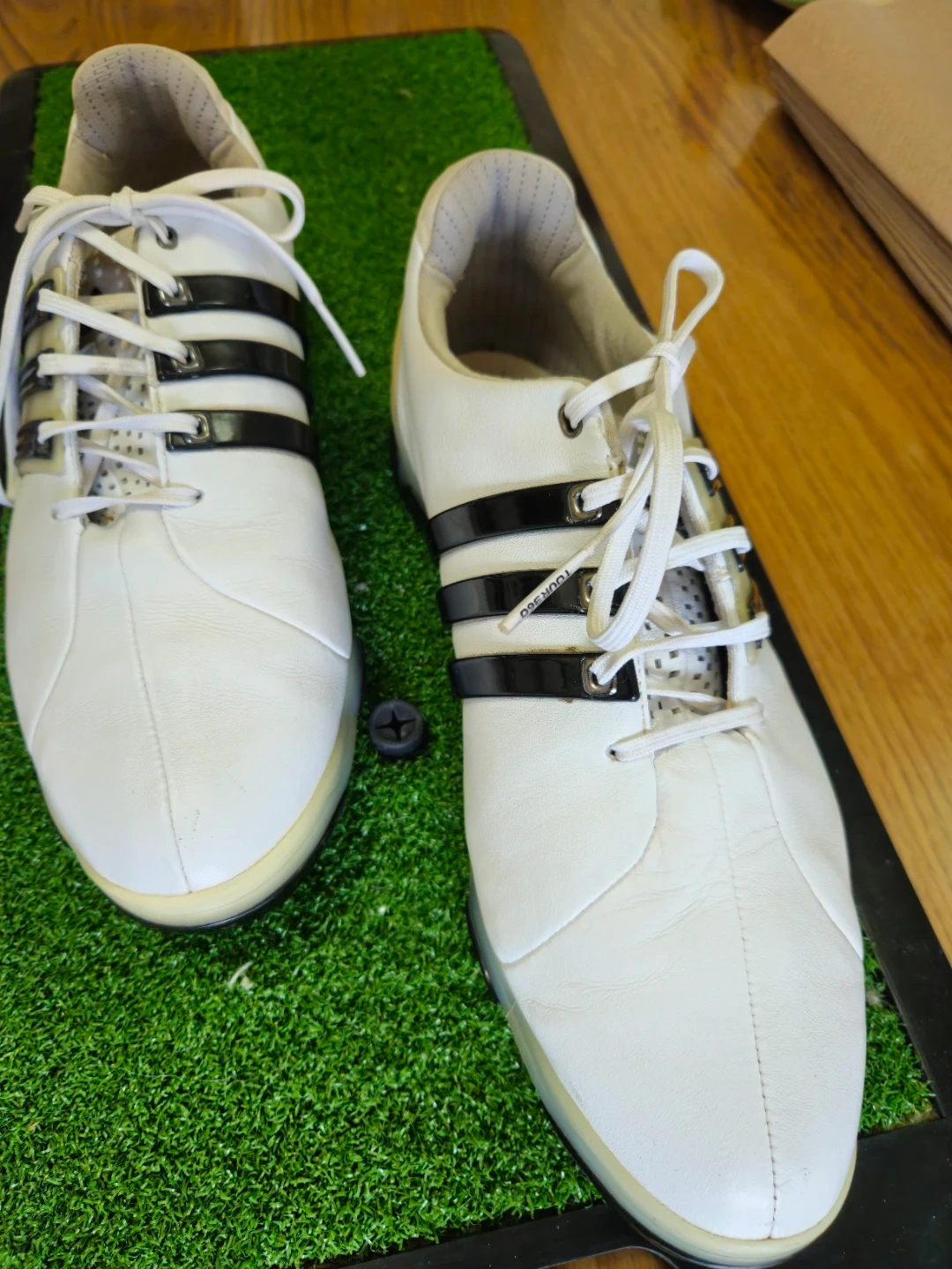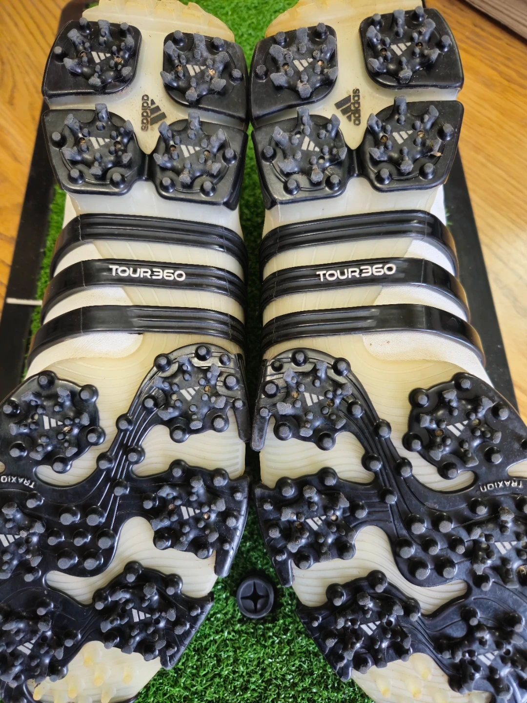 White Adidas Tour360 golf shoes with black stripes. These shoes are designed for golf performance. They feature a traditional lace-up closure and spikes for traction on the course.