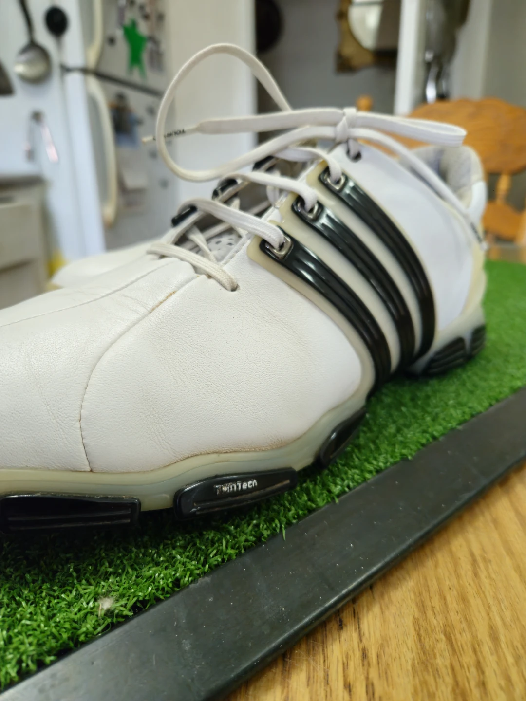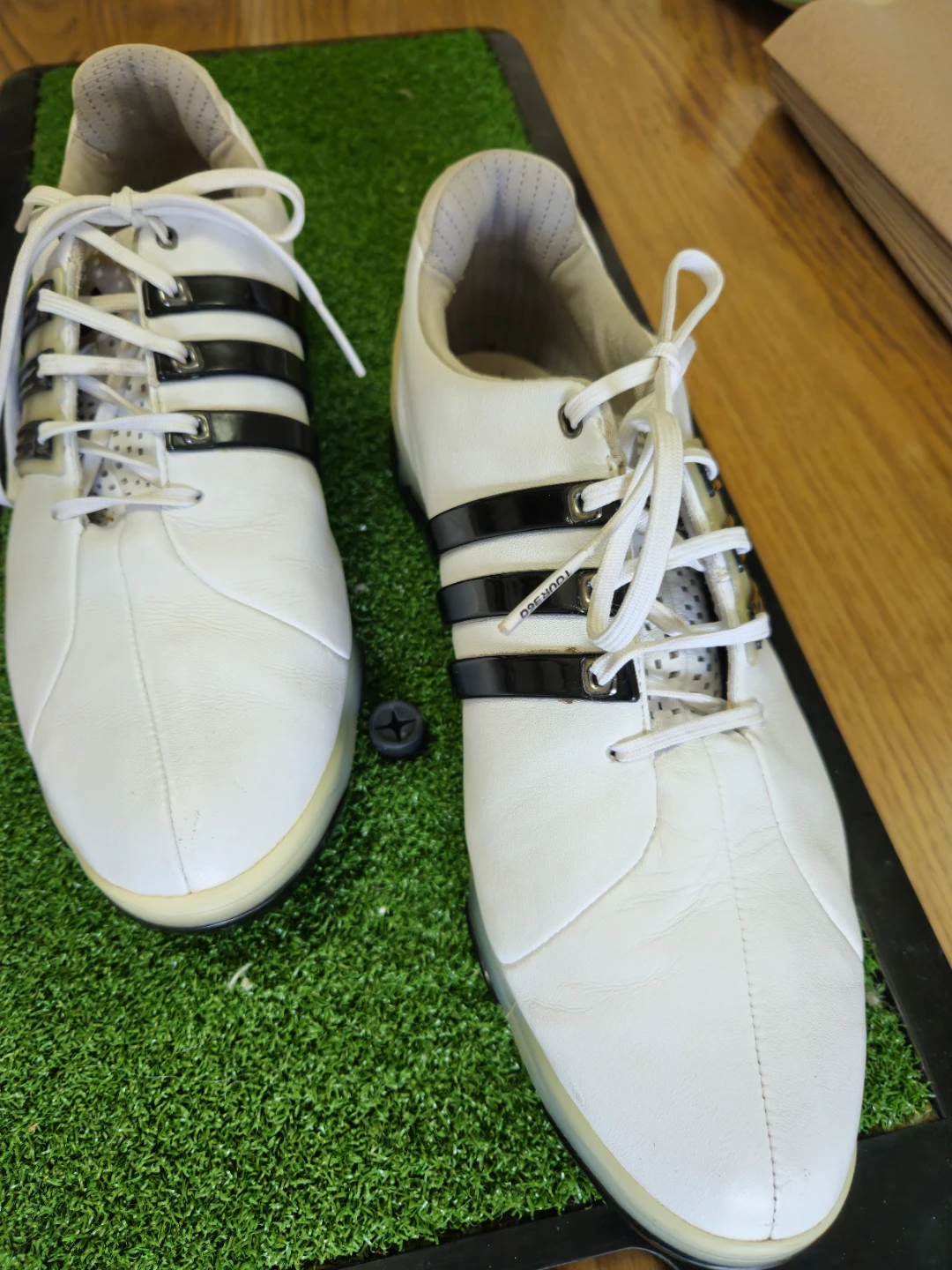 White Adidas Tour360 golf shoes with black stripes. These shoes are designed for golf performance. They feature a traditional lace-up closure and spikes for traction on the course.