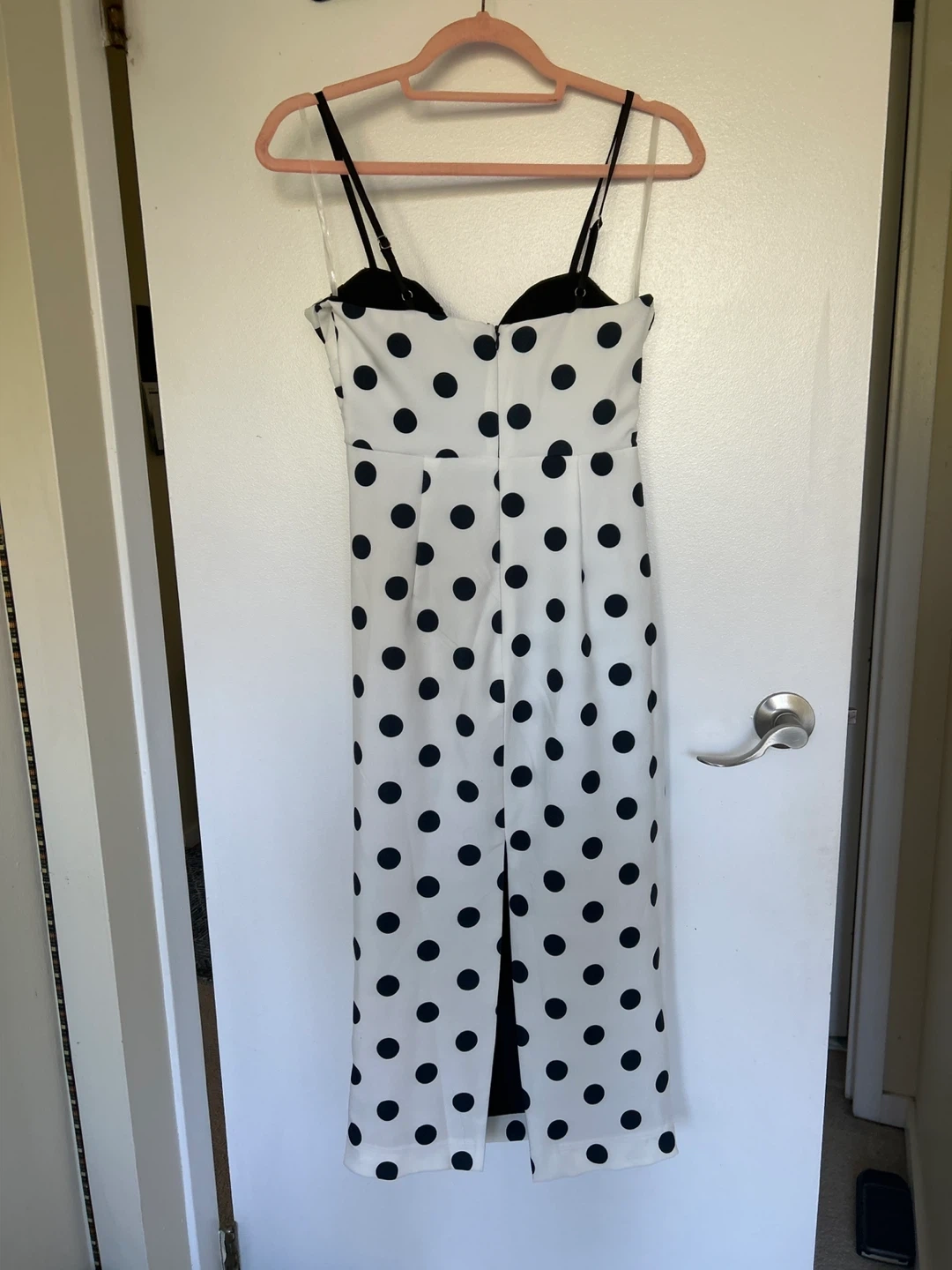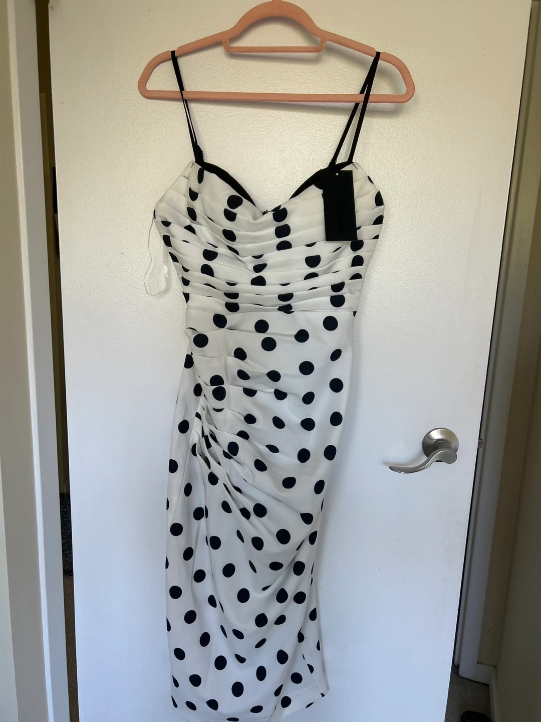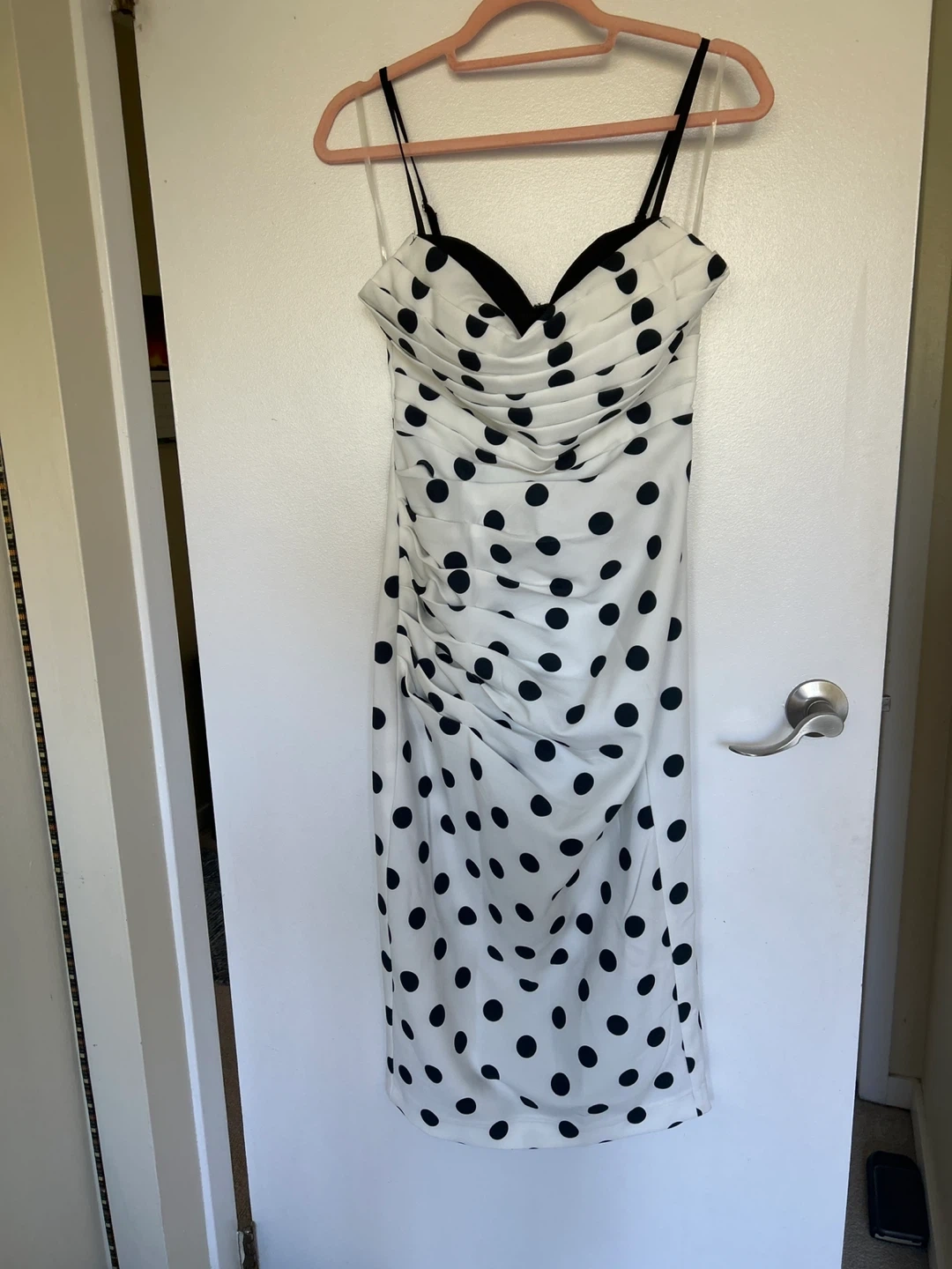 This white dress features a classic black polka dot pattern. It has adjustable spaghetti straps and a ruched detail on the side. The dress includes a back zipper closure. Novalux brend xs size 40cm long