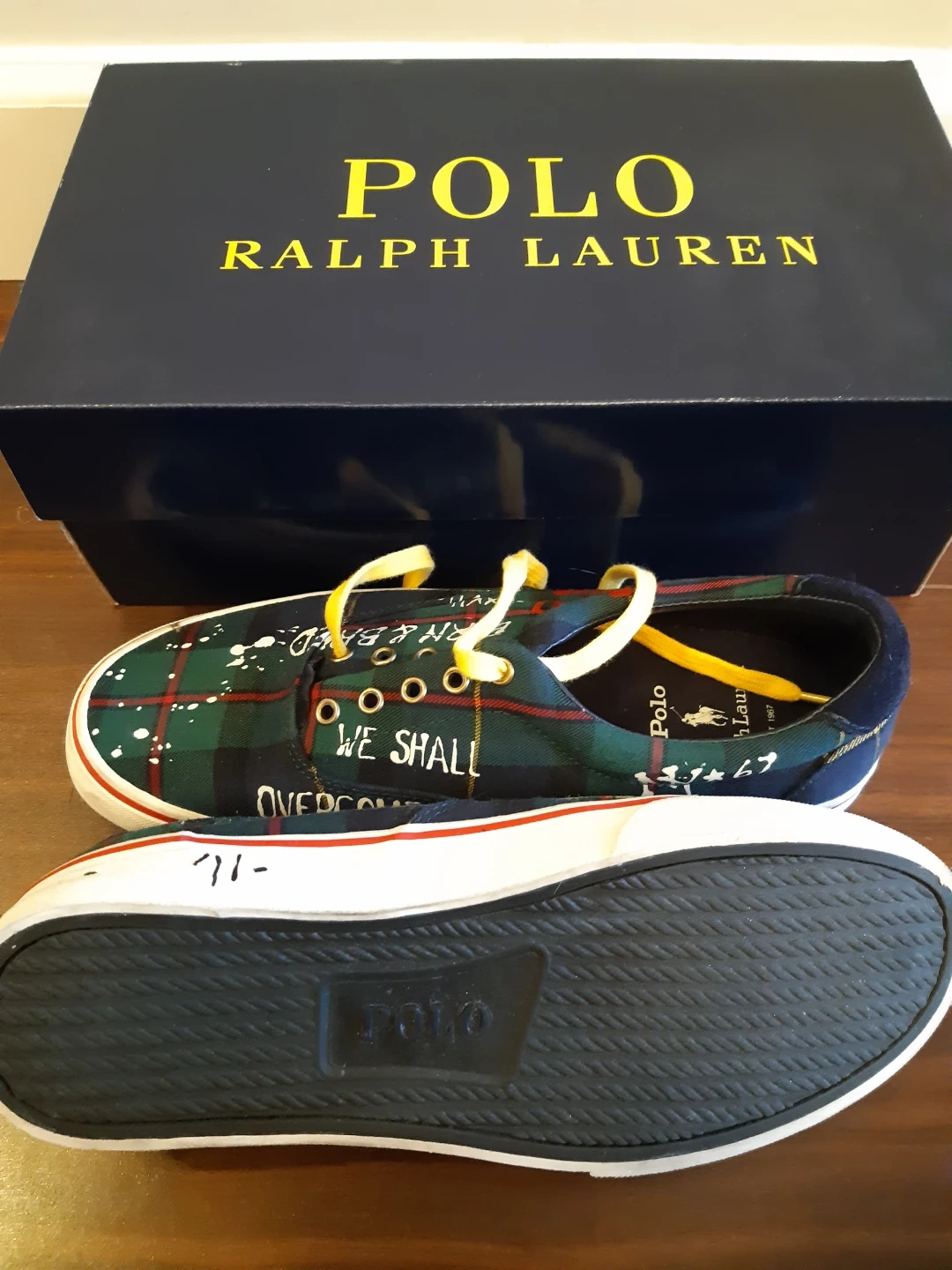 Green tartan print with graffiti accents sneakers. Yellow laces. Comes in original box. Size 8.5 D men
