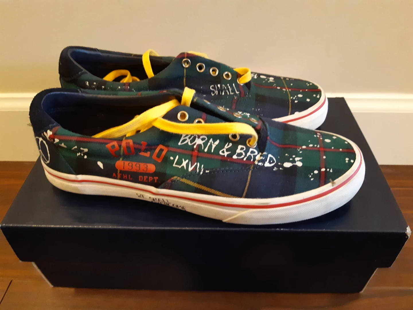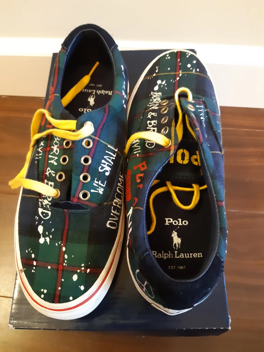 Green tartan print with graffiti accents sneakers. Yellow laces. Comes in original box. Size 8.5 D men