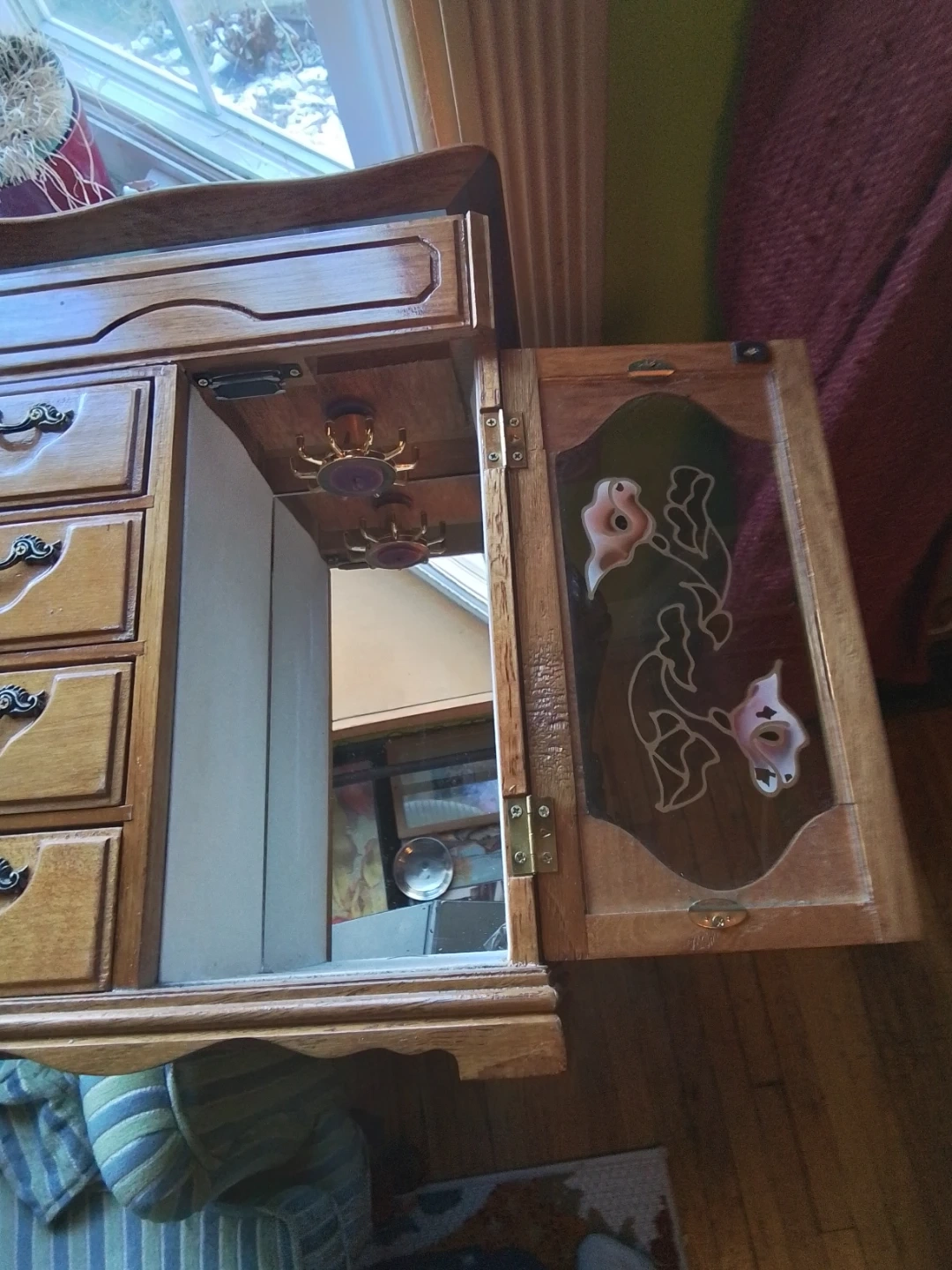 This wooden jewelry box features a mirrored lid and multiple compartments inside for organizing your accessories. It has four drawers on the side and a decorative stained-glass door with floral accents. Interior hooks are visible in the upper compartment for hanging items.