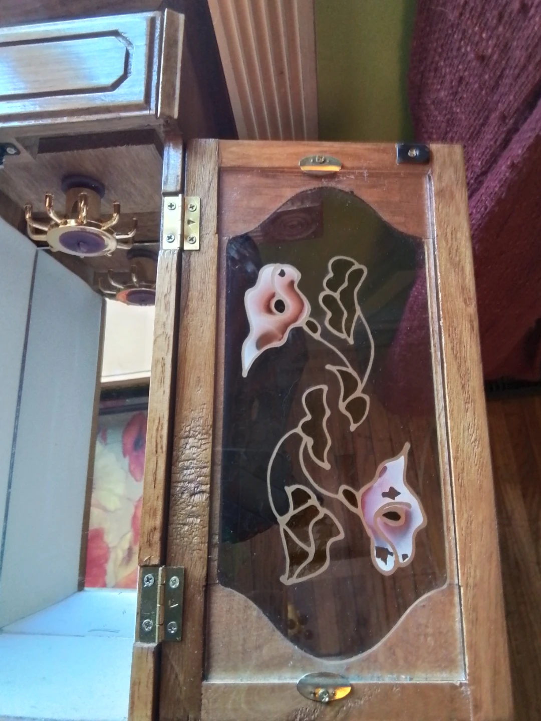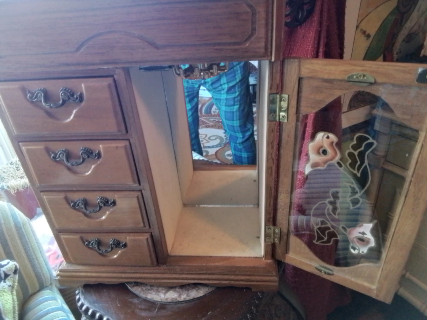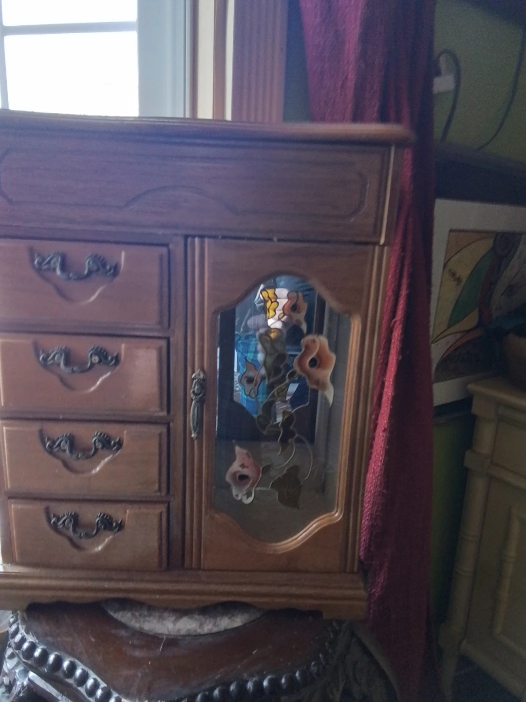 This wooden jewelry box features a mirrored lid and multiple compartments inside for organizing your accessories. It has four drawers on the side and a decorative stained-glass door with floral accents. Interior hooks are visible in the upper compartment for hanging items.