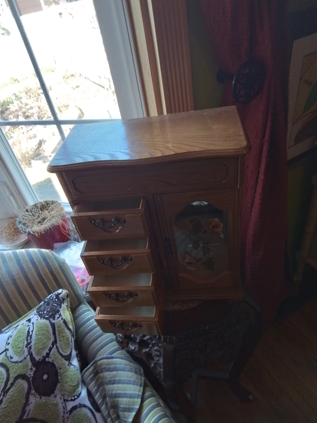 This used jewelry box, measuring 11.5x14x5 inches, features a charming stained glass door and multiple drawers for ample storage. It's perfect for organizing your precious pieces.