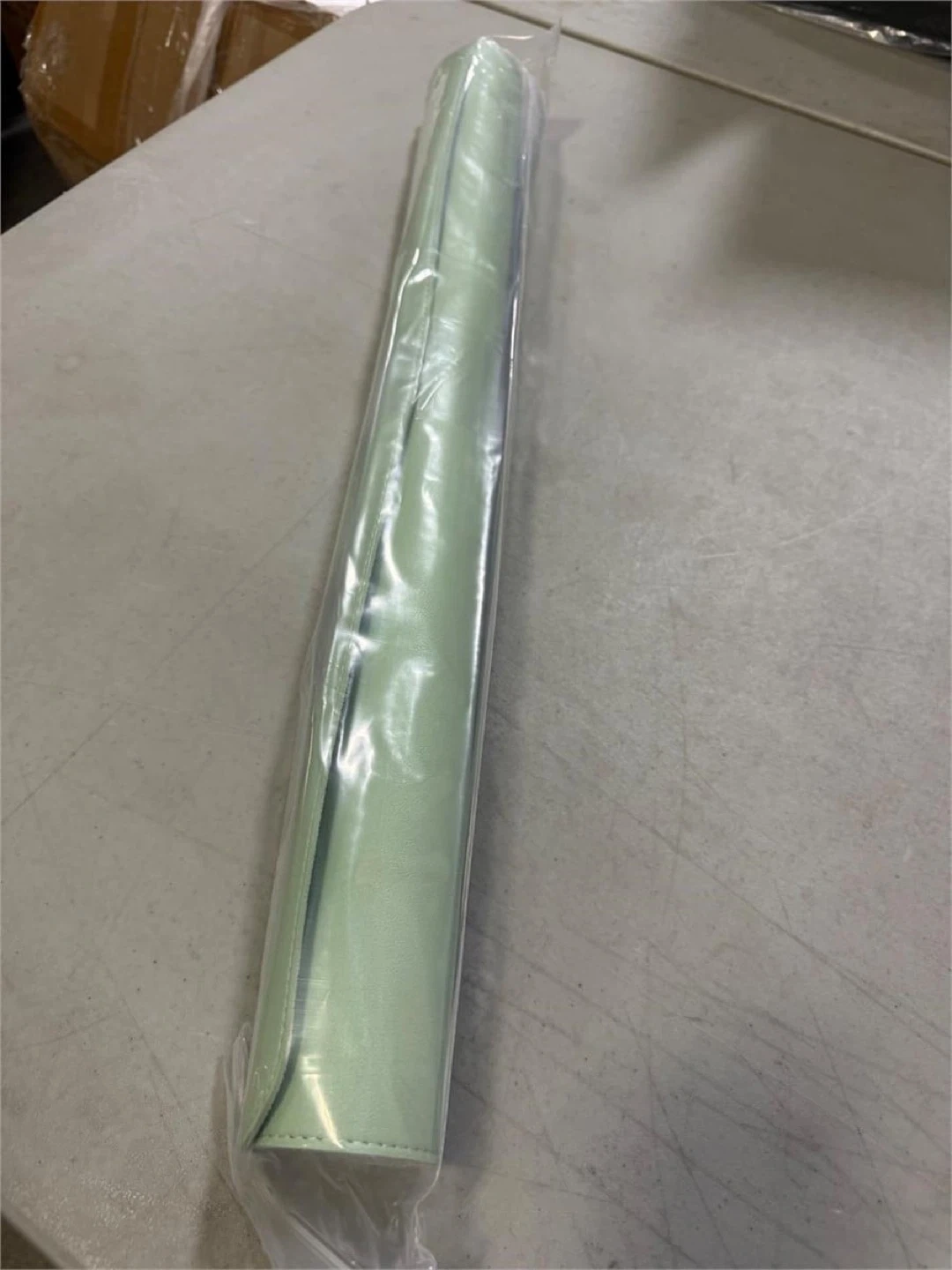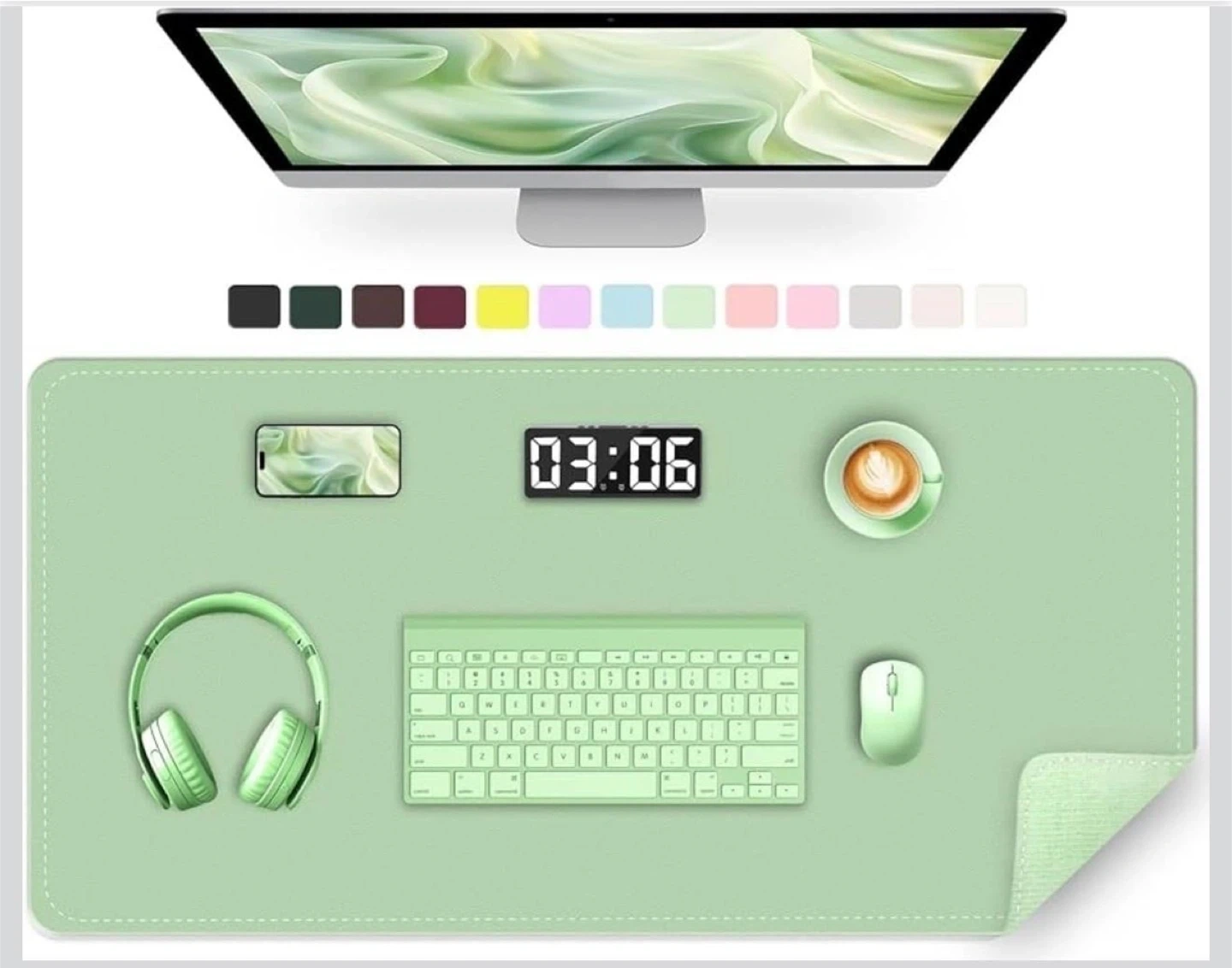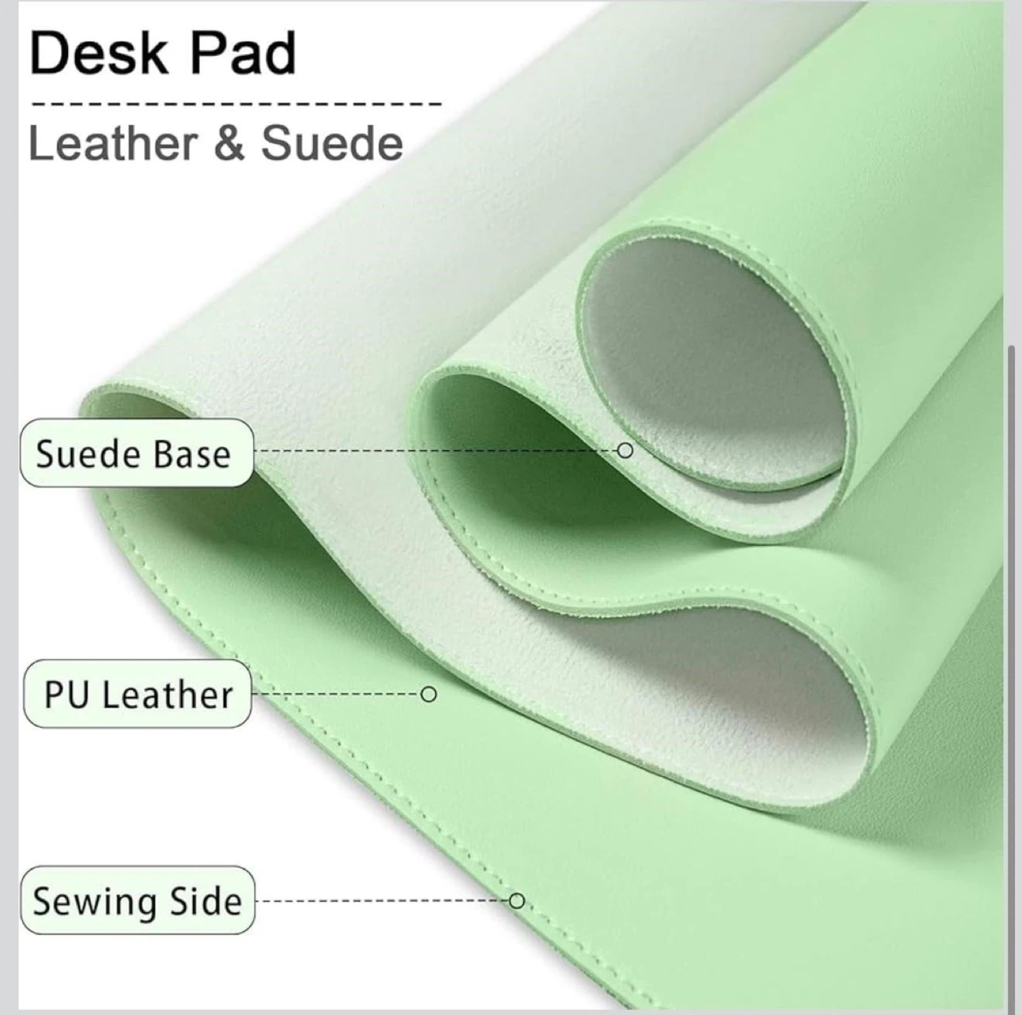 This desk pad is made with PU leather on the top and a suede base. It has a sewn edge for durability. The pad's smooth surface helps your mouse glide easily. It's also water-resistant and easy to clean!