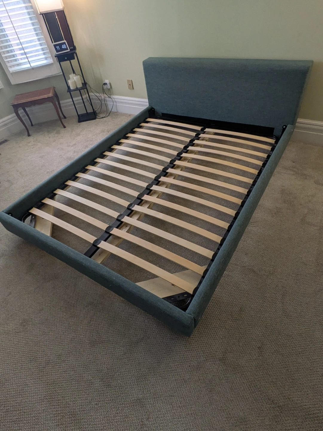 Used EQ3 bento teal upholstered platform Queen bed frame. Slats/platform are a single piece (60"x78") and not flat pack/foldable. Rest of frame has been disassembled (headboard, footboard, two side rails, corner wood brackets). All hardware and feet included (drill or screwdriver required for assembly). Headboard height is 28.5 inches.