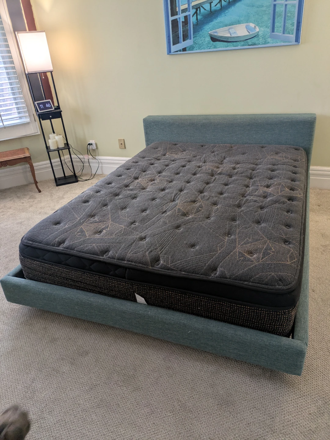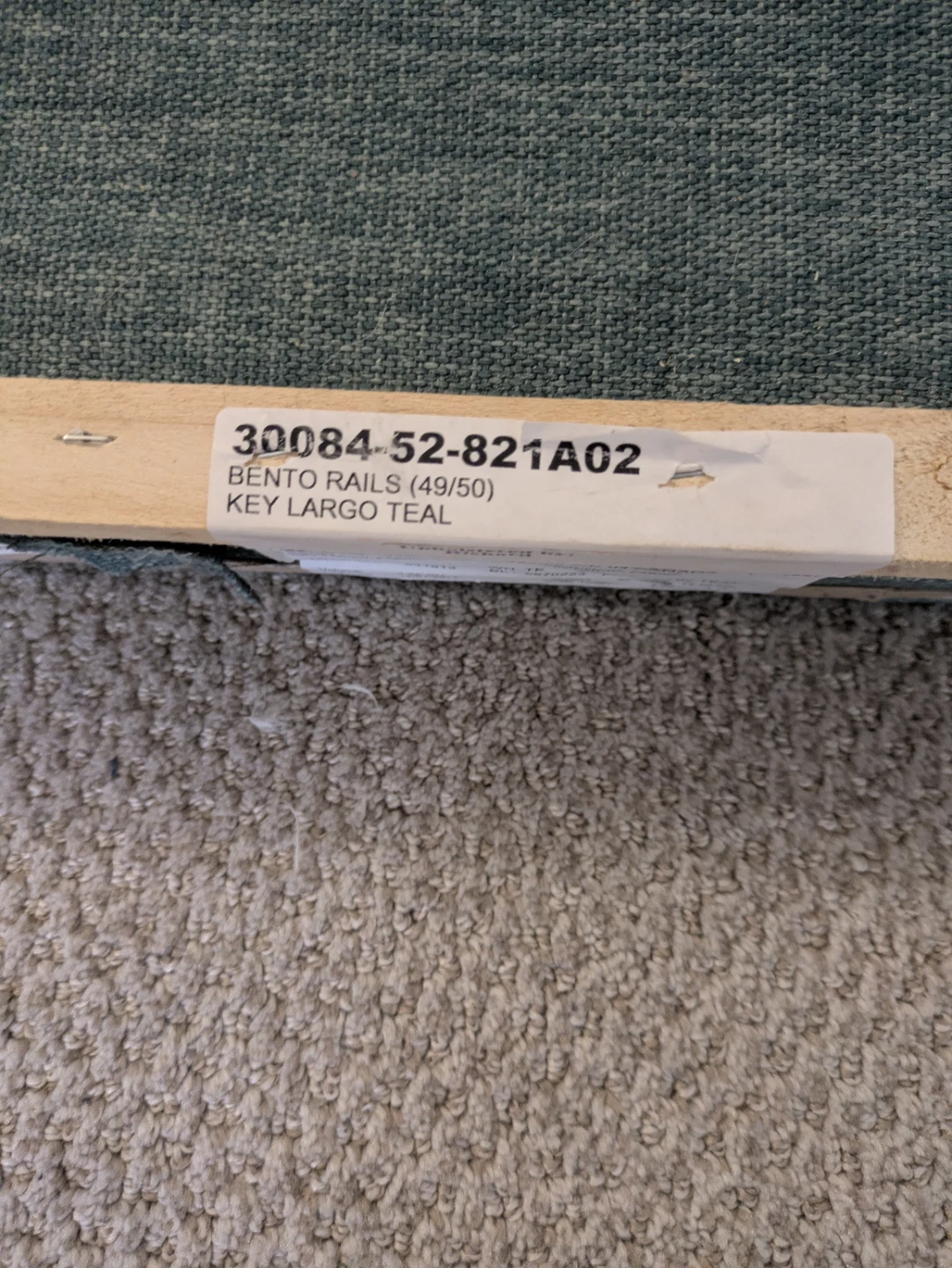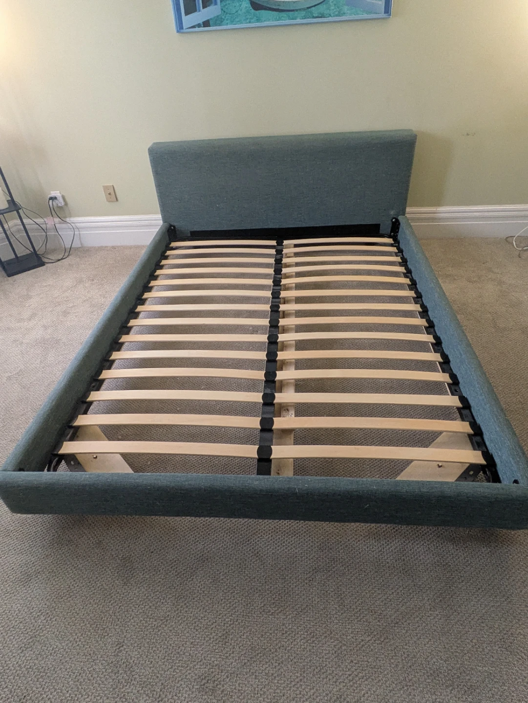 Used EQ3 bento teal upholstered platform Queen bed frame. Slats/platform are a single piece (60"x78") and not flat pack/foldable. Rest of frame has been disassembled (headboard, footboard, two side rails, corner wood brackets). All hardware and feet included (drill or screwdriver required for assembly). Headboard height is 28.5 inches.