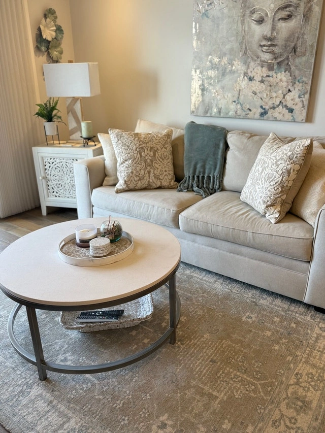 Moving Sale! Crate and Barrel limestone coffee table featuring a sleek metal base and a durable limestone top, perfect for adding a touch of modern elegance to your living space. Excellent condition. Original $803. Brand: Crate and Barrel. Material: Limestone top, metal base. Shape: Round 3'. Pick up Quarry Park SE. Cash only.