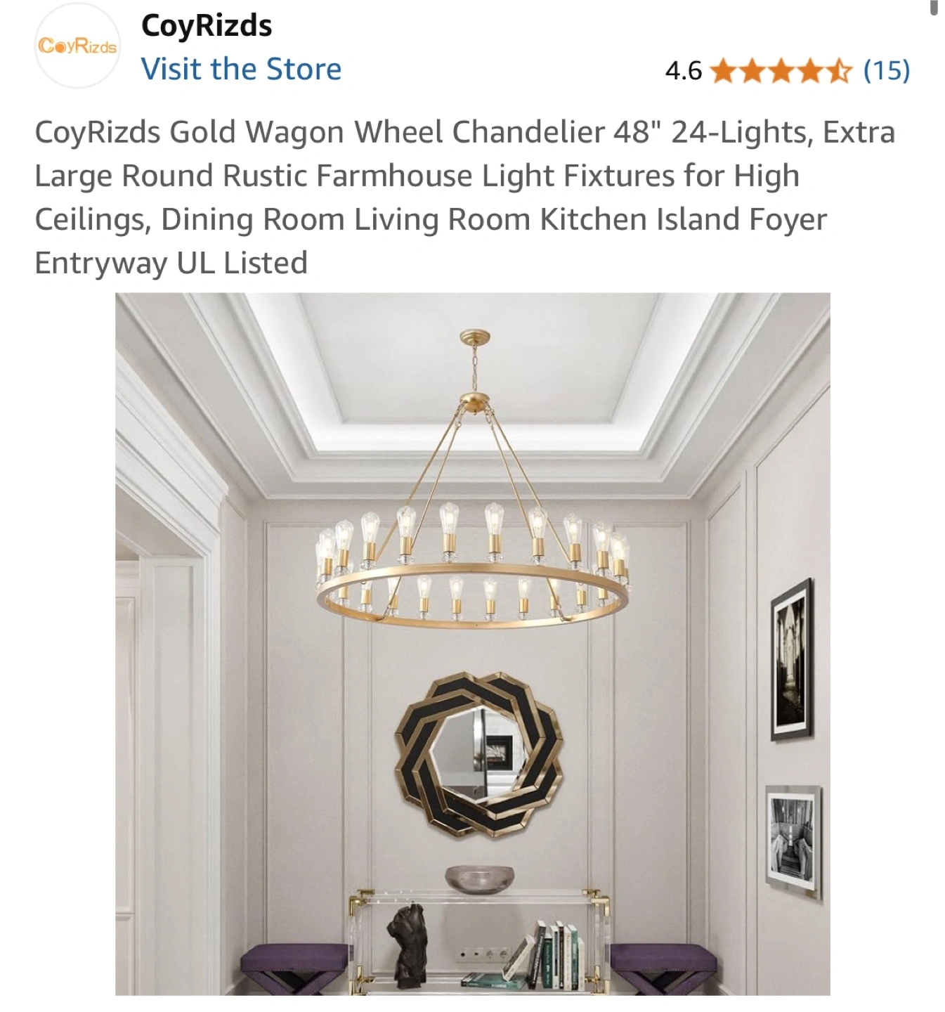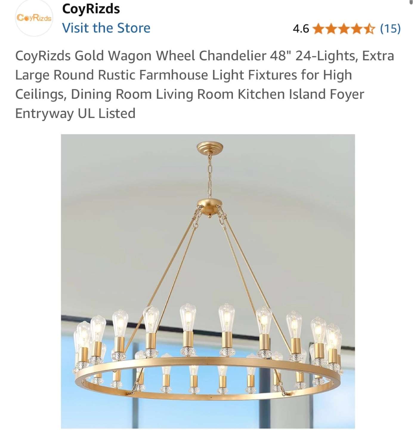 Selling a CoyRizds Gold Wagon Wheel Chandelier, perfect for adding a rustic farmhouse touch to your dining room, living room, kitchen island, or foyer! It features 24 lights and is designed for high ceilings. The chandelier has a diameter of 48 inches and an adjustable height up to 78.74 inches. The bulb base is E26, and it supports 110-120V voltage