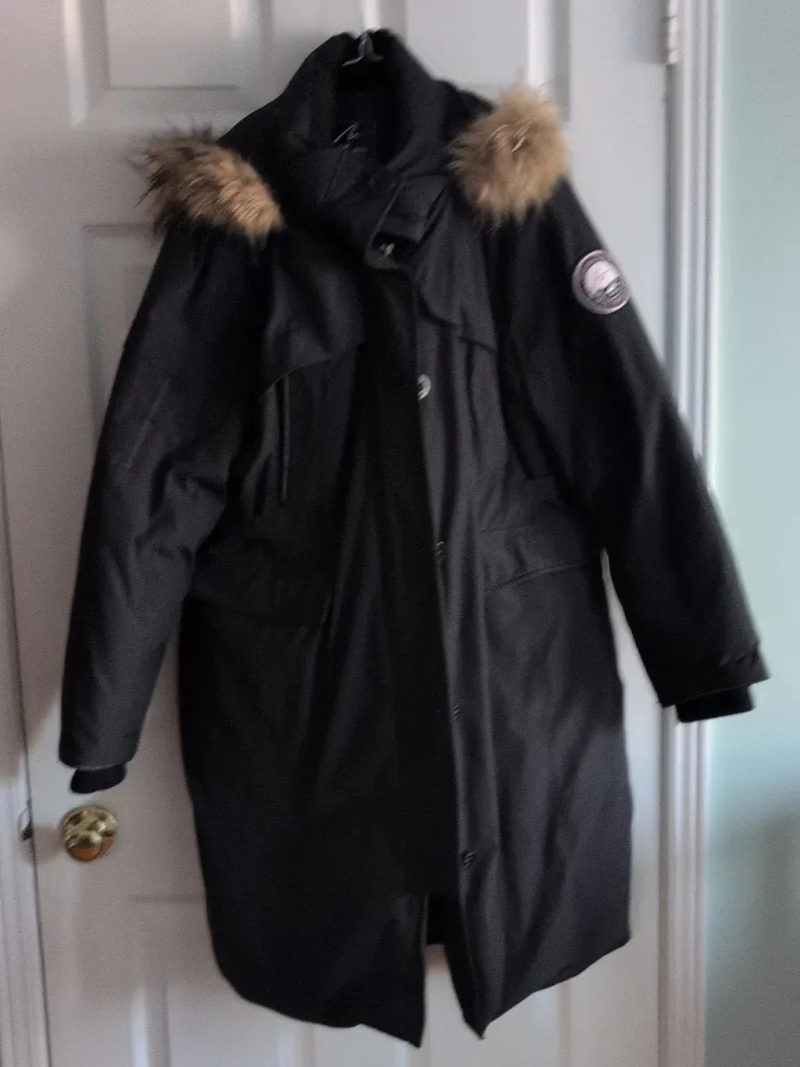 Black parka jacket with a fur-lined hood. This jacket appears to be mid-length and includes multiple pockets. It's designed for cold weather.