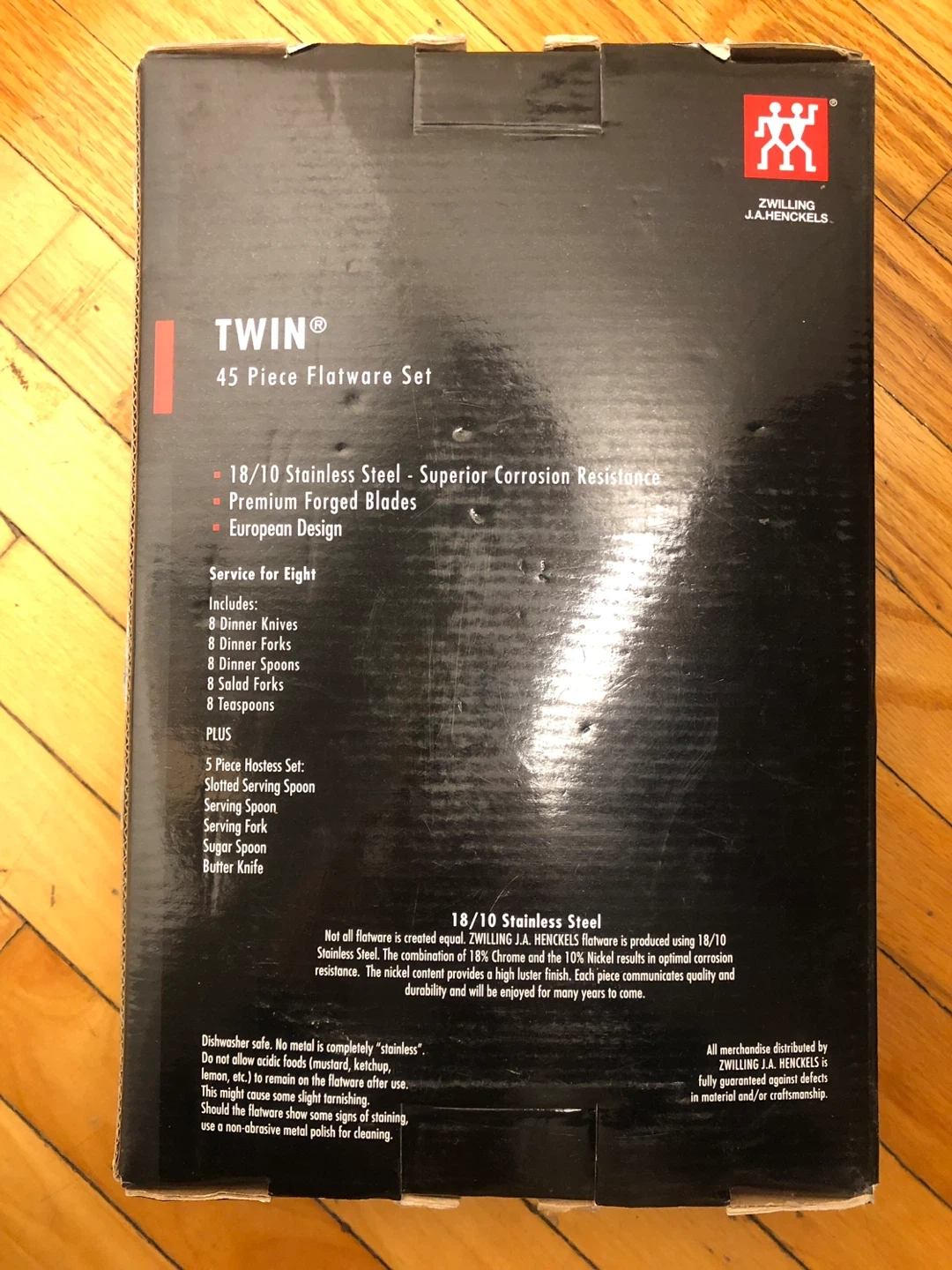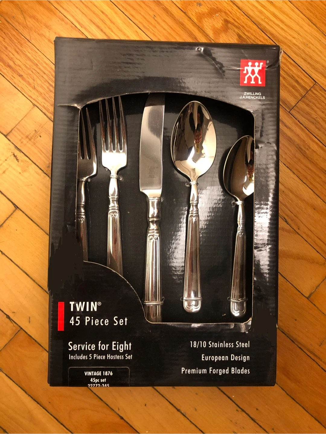 110Selling a Zwilling J.A. Henckels TWIN 45-piece flatware set, service for eight. The set includes: - 8 Dinner Knives - 8 Dinner Forks - 8 Dinner Spoons - 8 Salad Forks - 8 Teaspoons Plus a 5-piece hostess set with slotted serving spoon, serving spoon, serving fork, sugar spoon, and butter knife. Made with 18/10 stainless steel for superior corrosion resistance and premium forged blades. Box included!