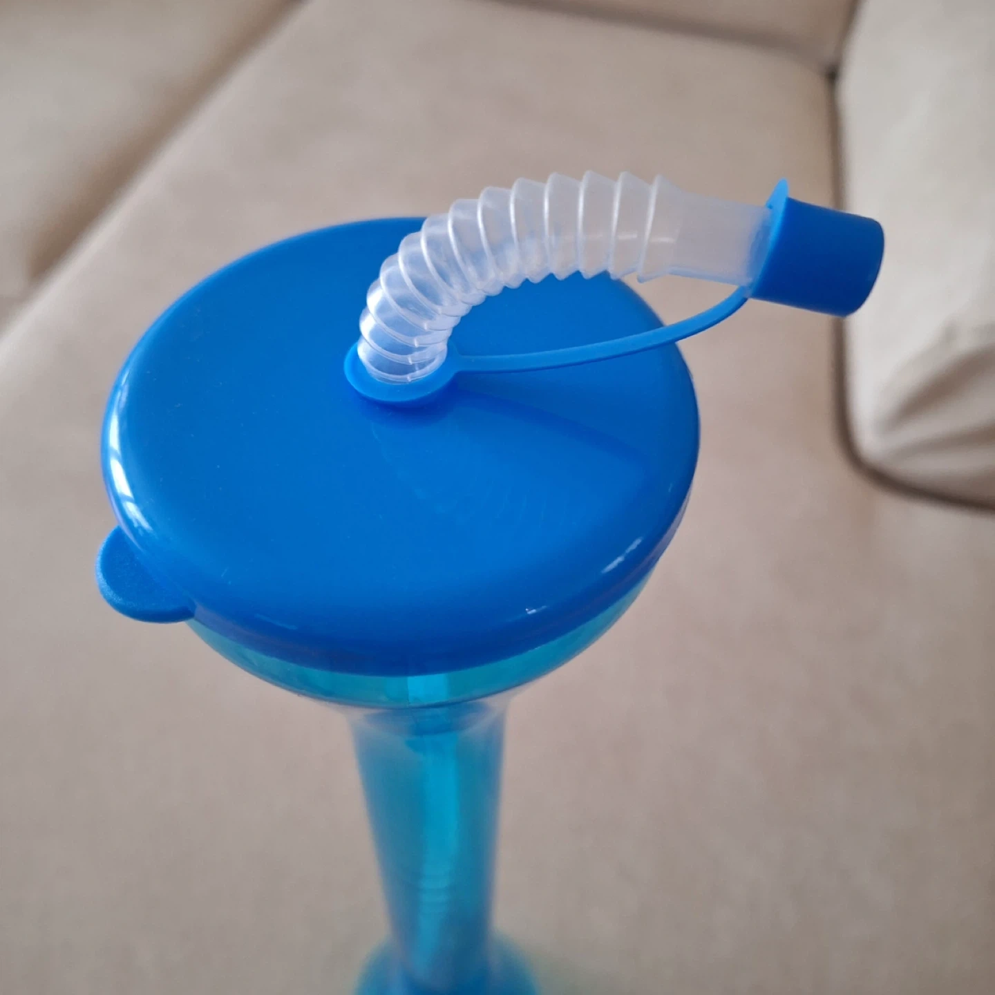 This blue novelty tumbler comes with a flexible straw and cap. It's made of plastic and is sealed in its original packaging. It's a fun way to enjoy your beverages!