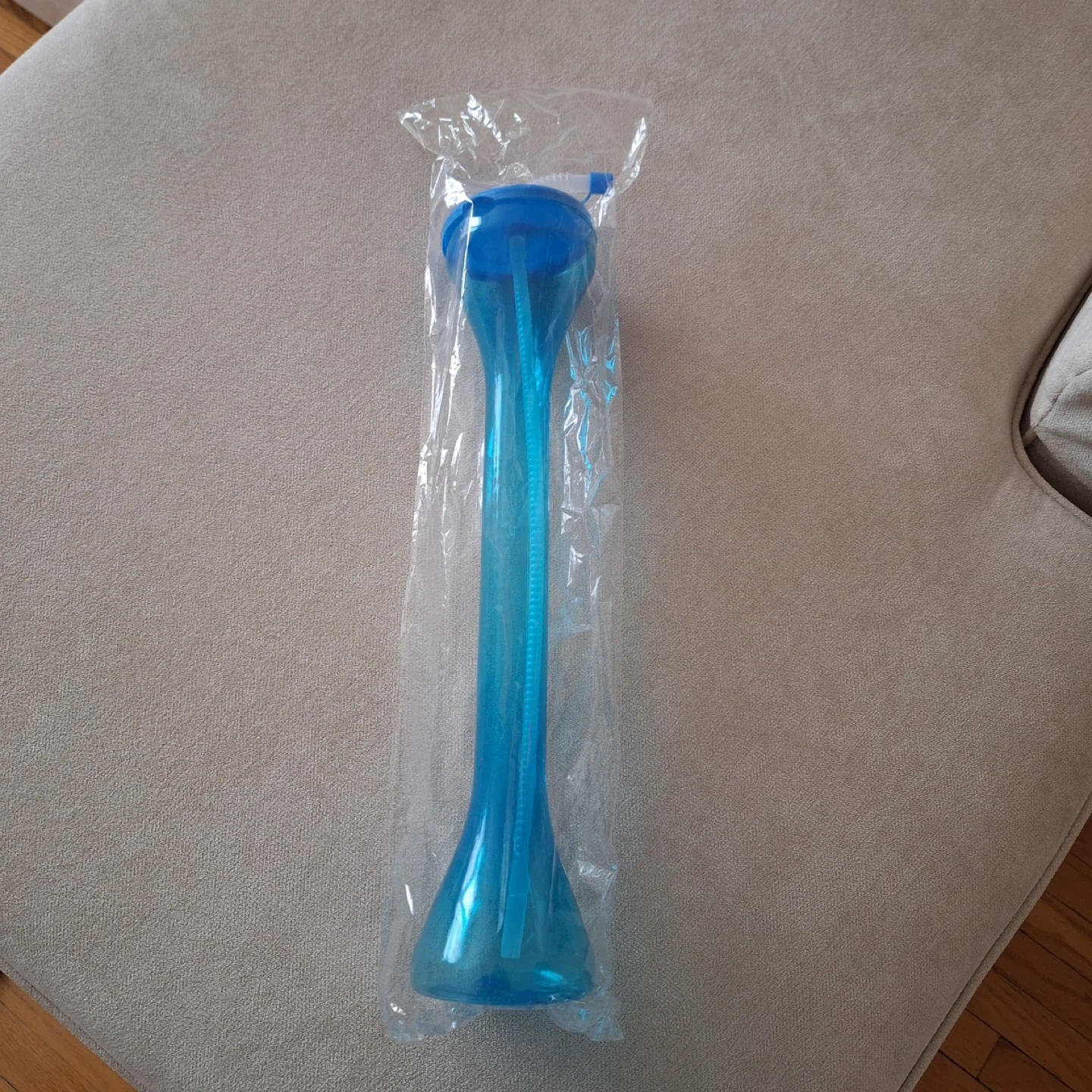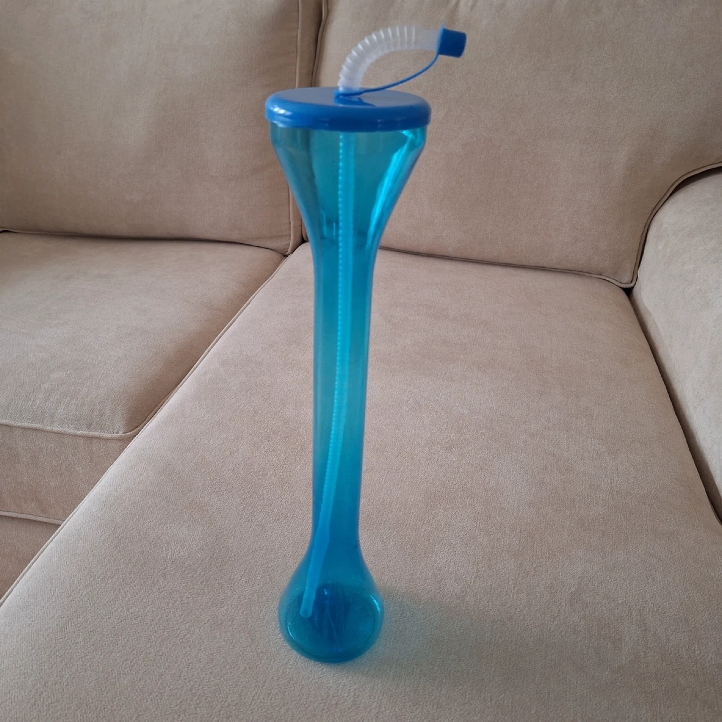 This blue novelty tumbler comes with a flexible straw and cap. It's made of plastic and is sealed in its original packaging. It's a fun way to enjoy your beverages!